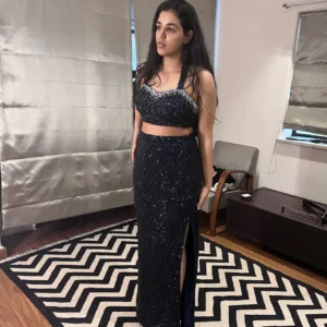JV’s pre-draped champagne saree, paired with a hand-embellished blouse, is the perfect bridesmaid moment—effortless, glamorous, and made to turn heads. It has also been styled with a modern gold blouse that redefines elegance, this look is all about versatility. The sleek, statement blouse not only complements the saree beautifully but also stands out as a versatile piece, perfect beyond the occasion.