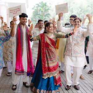 With her first steps into her new home, adorned in a custom Jesal Vora creation, our bride weaves an integral part of her story, a treasured heirloom that will forever evoke the magic of her Ghar Pravesh