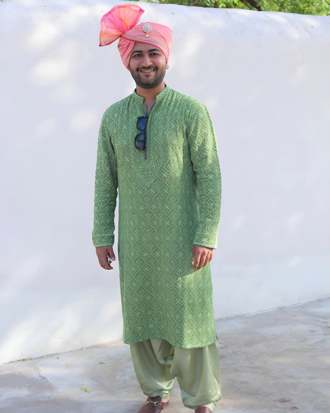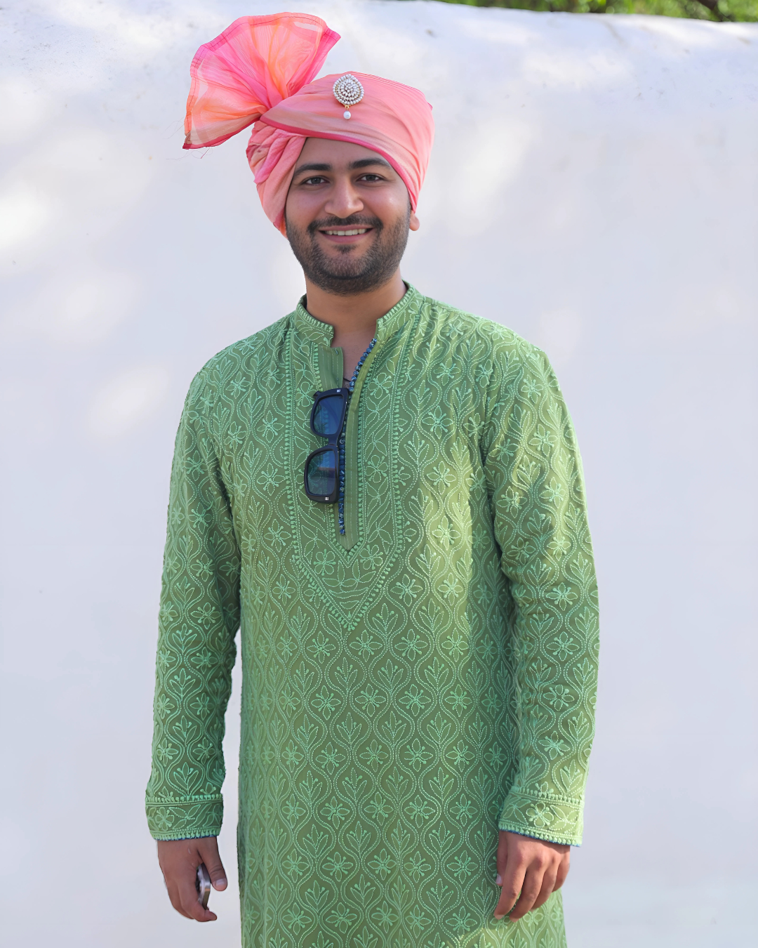 A custom-made classic Lucknowi kurta in soothing sage green, meticulously crafted for a religious function.