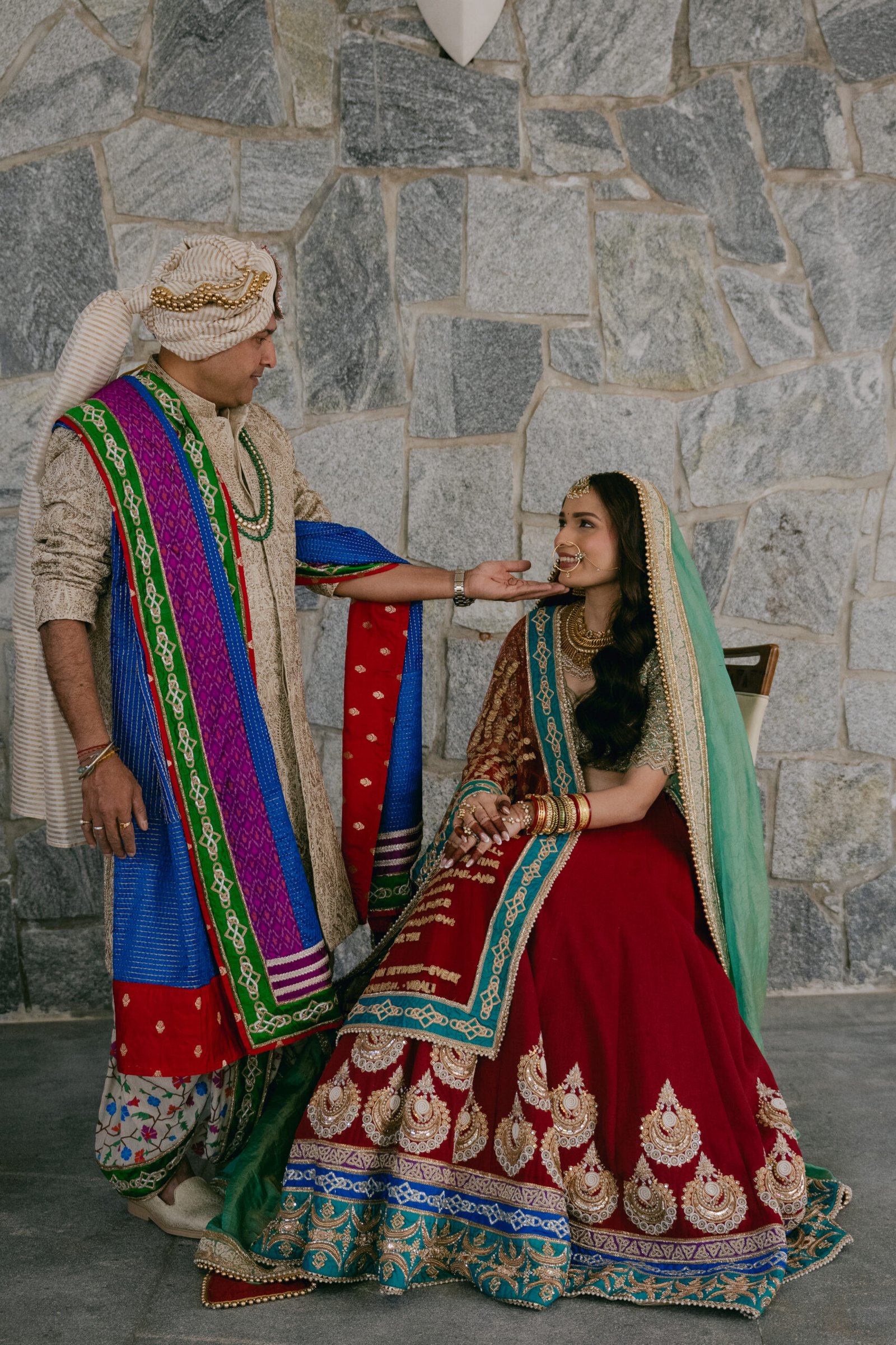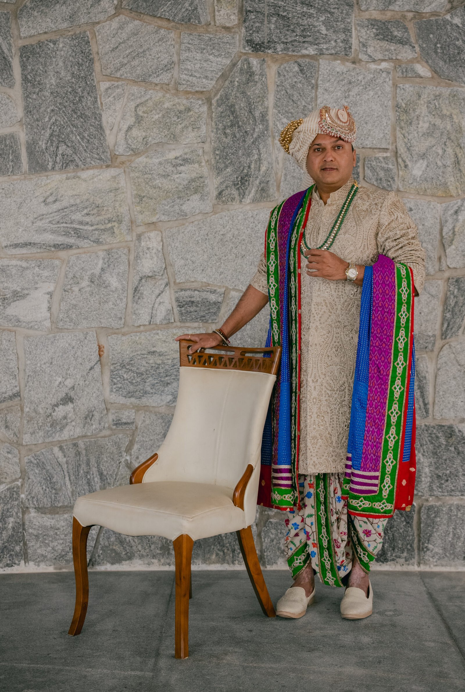 For the bride’s father, we designed a sherwani adorned with intricate marodi and zardozi work. It was paired with a traditional Paithani dhoti and a Banarasi stole, featuring the bride and groom’s wedding logo—a Celtic knot.