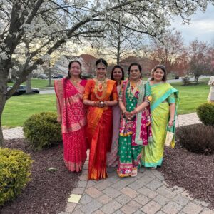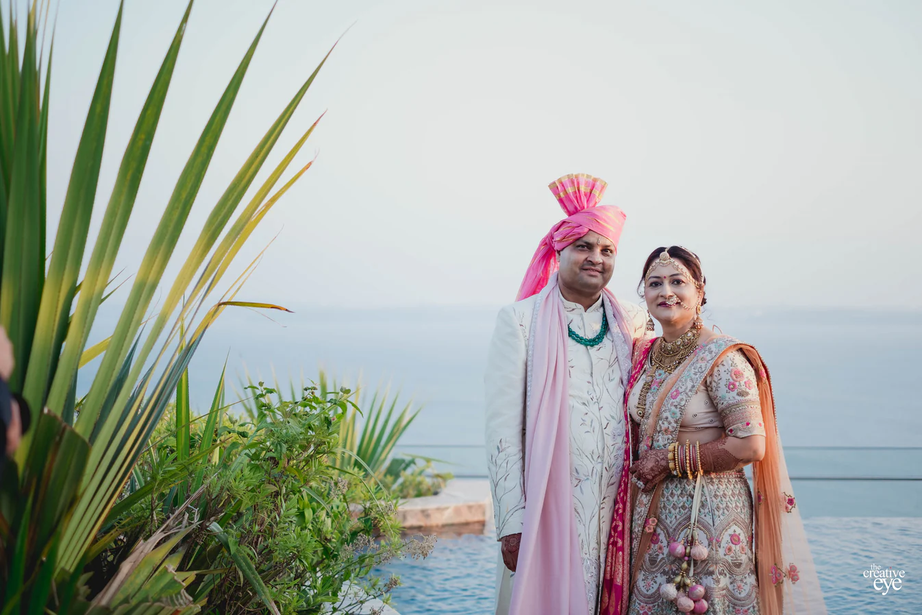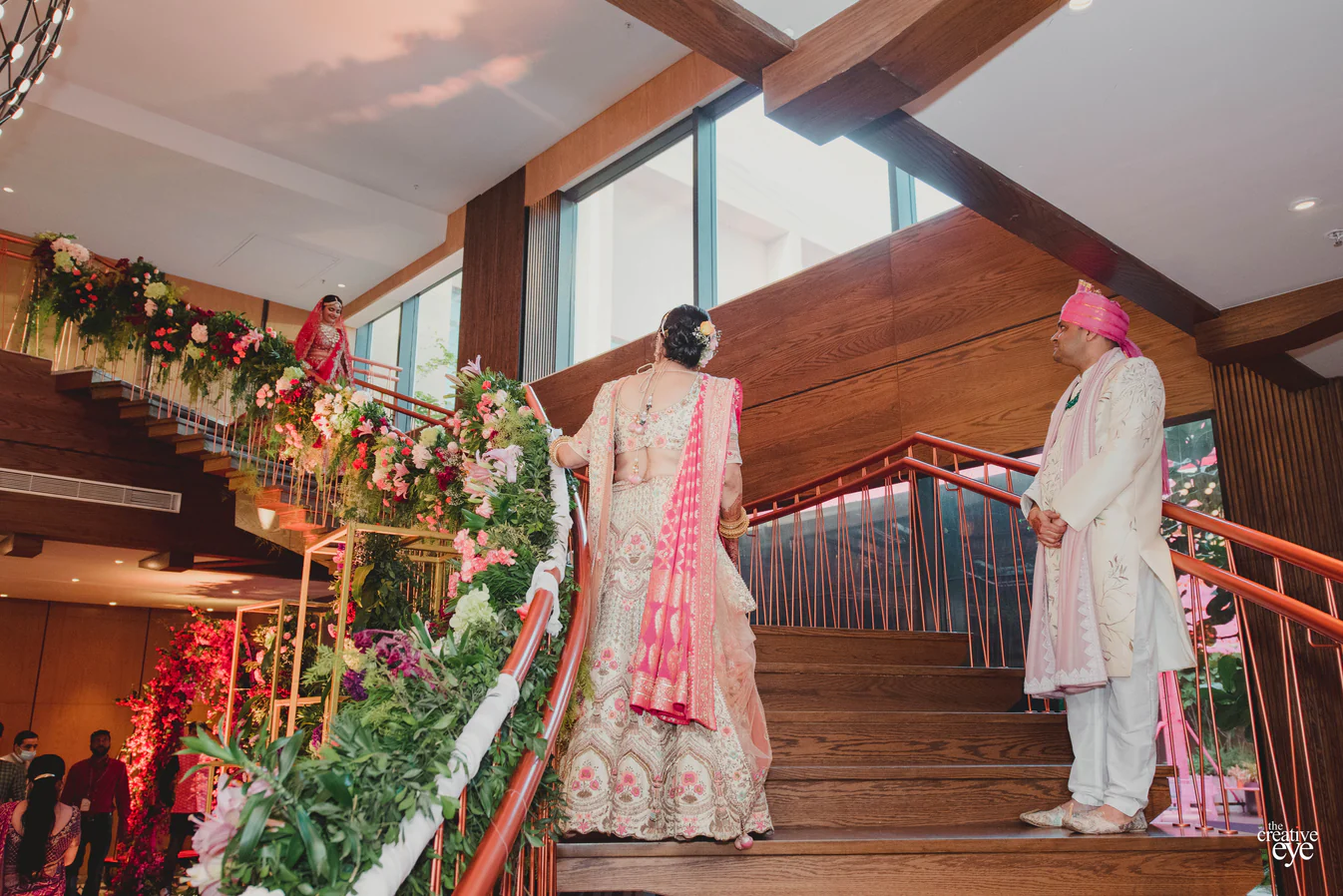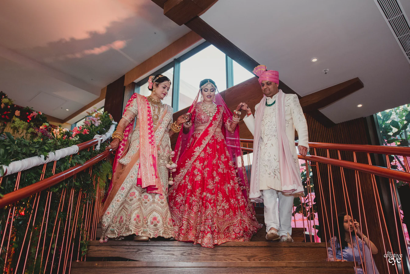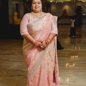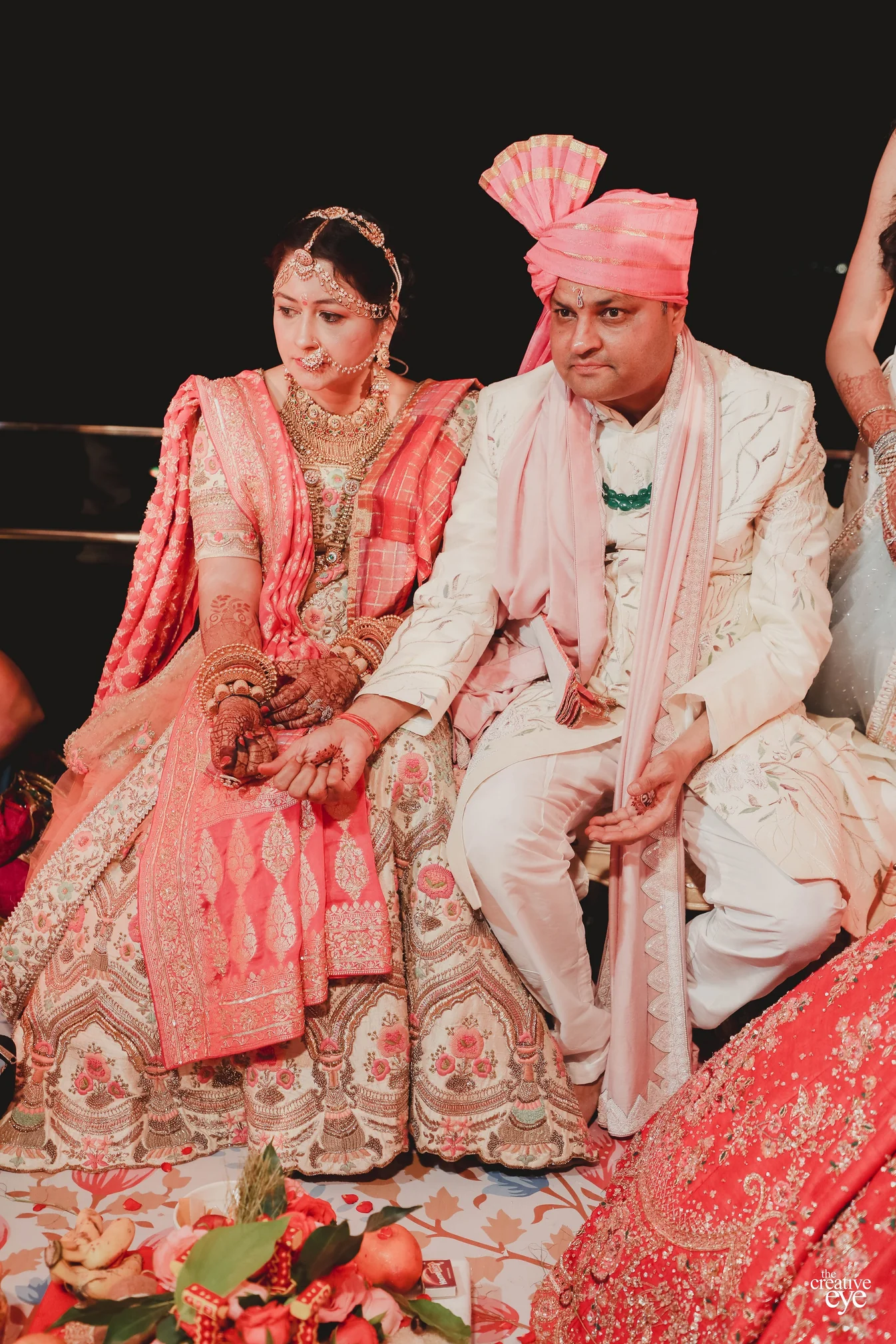Our Marvari client wanted a lehenga for her daughter’s Jaipur wedding. We designed a stunning lehenga for her with geometric and floral resham handwork in different hues of pink and a pink net dupatta to finish the look. Additionally, we have gave her a upaddha bandhani dupatta for the pheras.
