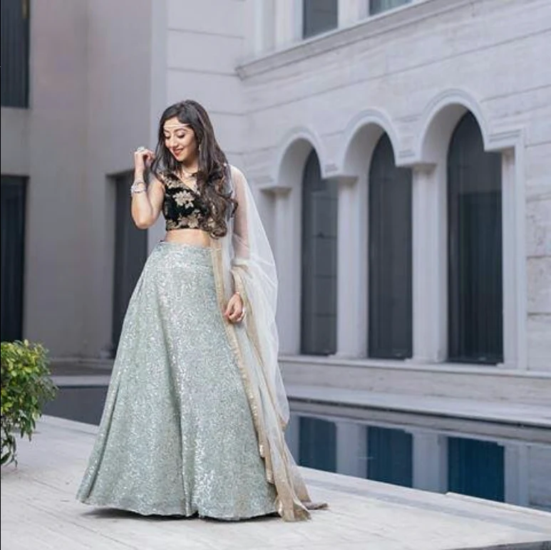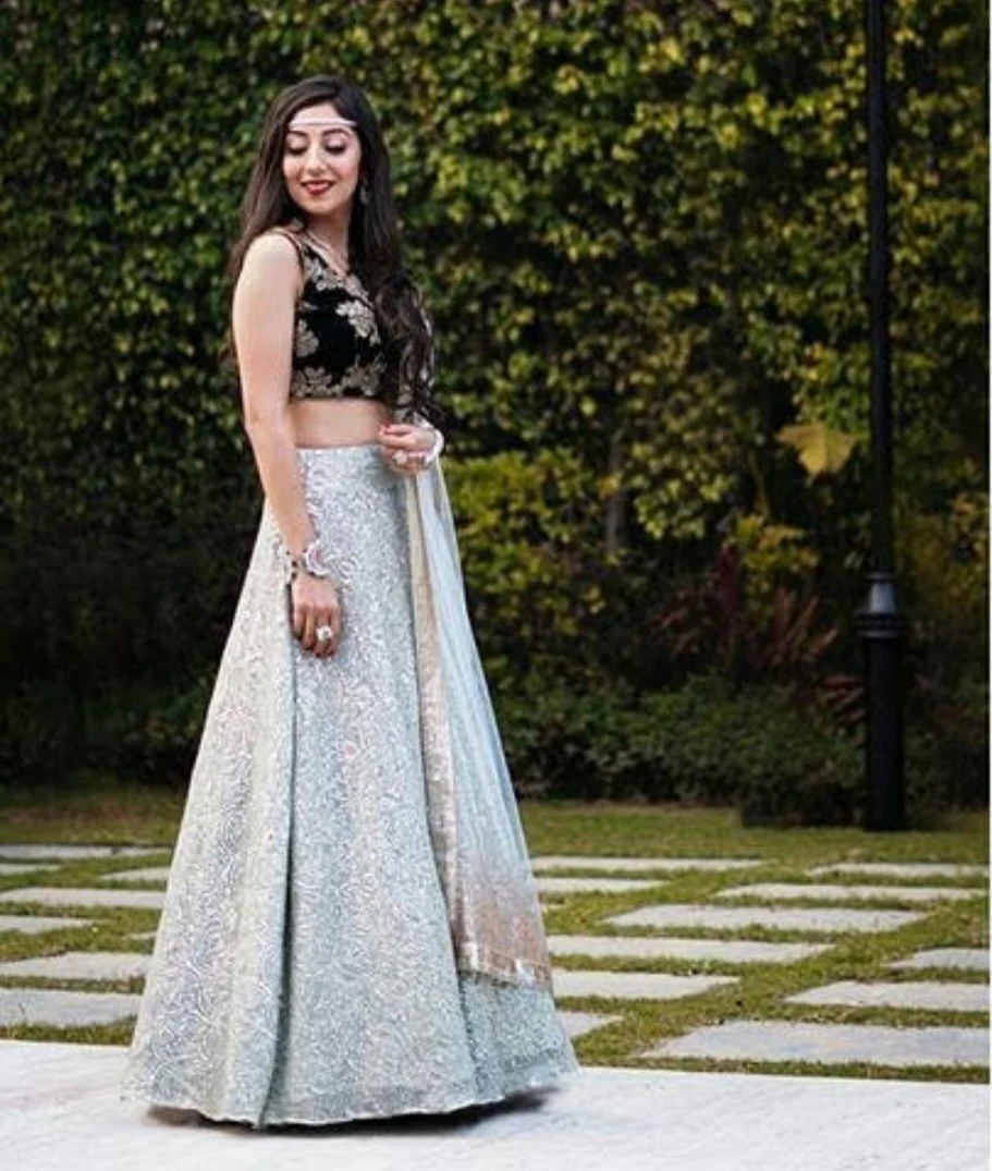 We created this beautiful pastel blue lehenga for our client, for her brother’s engagement ceremony. The look was highlighted by silver handwork all over the lehenga and velvet blouse for the winter event.