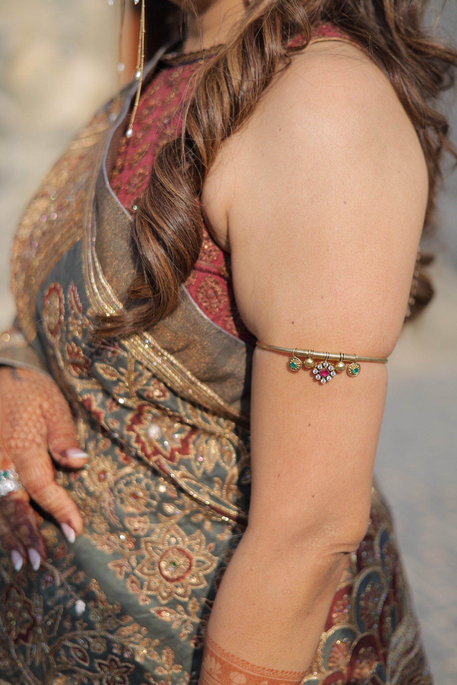 A delicate take on traditional elegance, this arm cuff is handcrafted in sterling silver. Adorned with vibrant rubies, emeralds, and subtle kundan stones, it features fine pearl drops that add gentle movement and charm. Light yet striking, it brings a refined, heritage touch to any ensemble.