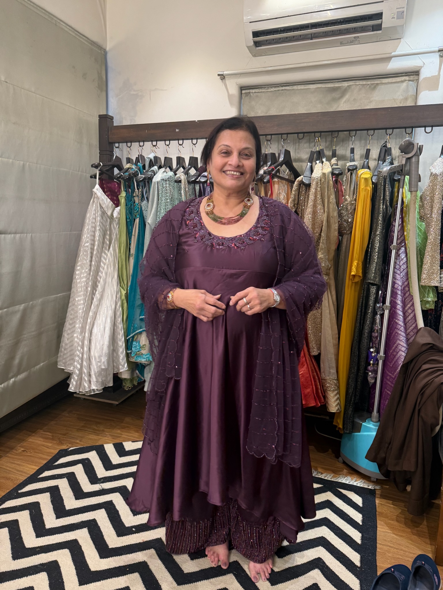 A simple yet elegant purple long kurta set, elevated with a delicately handcrafted neckline.