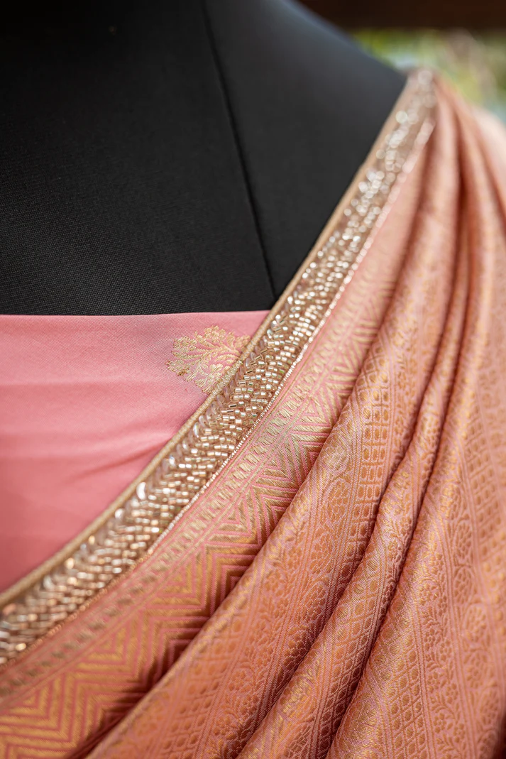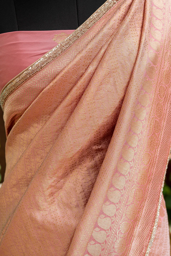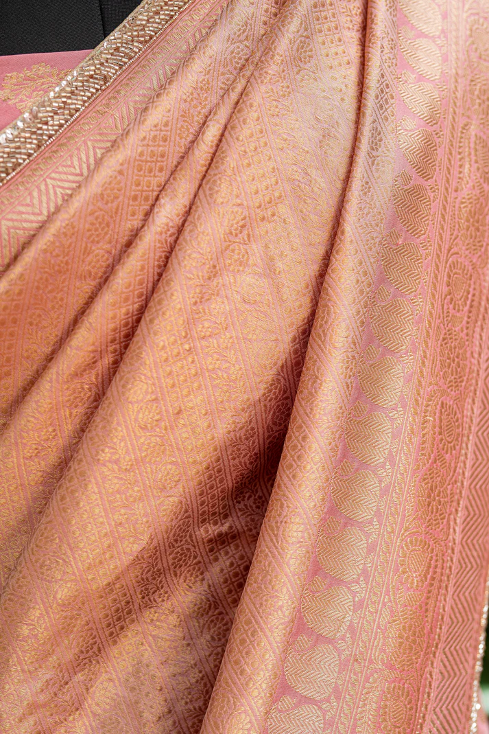 Handcrafted Jesal Vora pastel pink Banarasi silk Saree with hand embellished border paired with a pink blouse piece.
