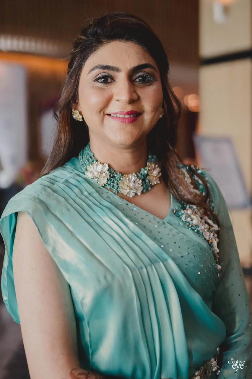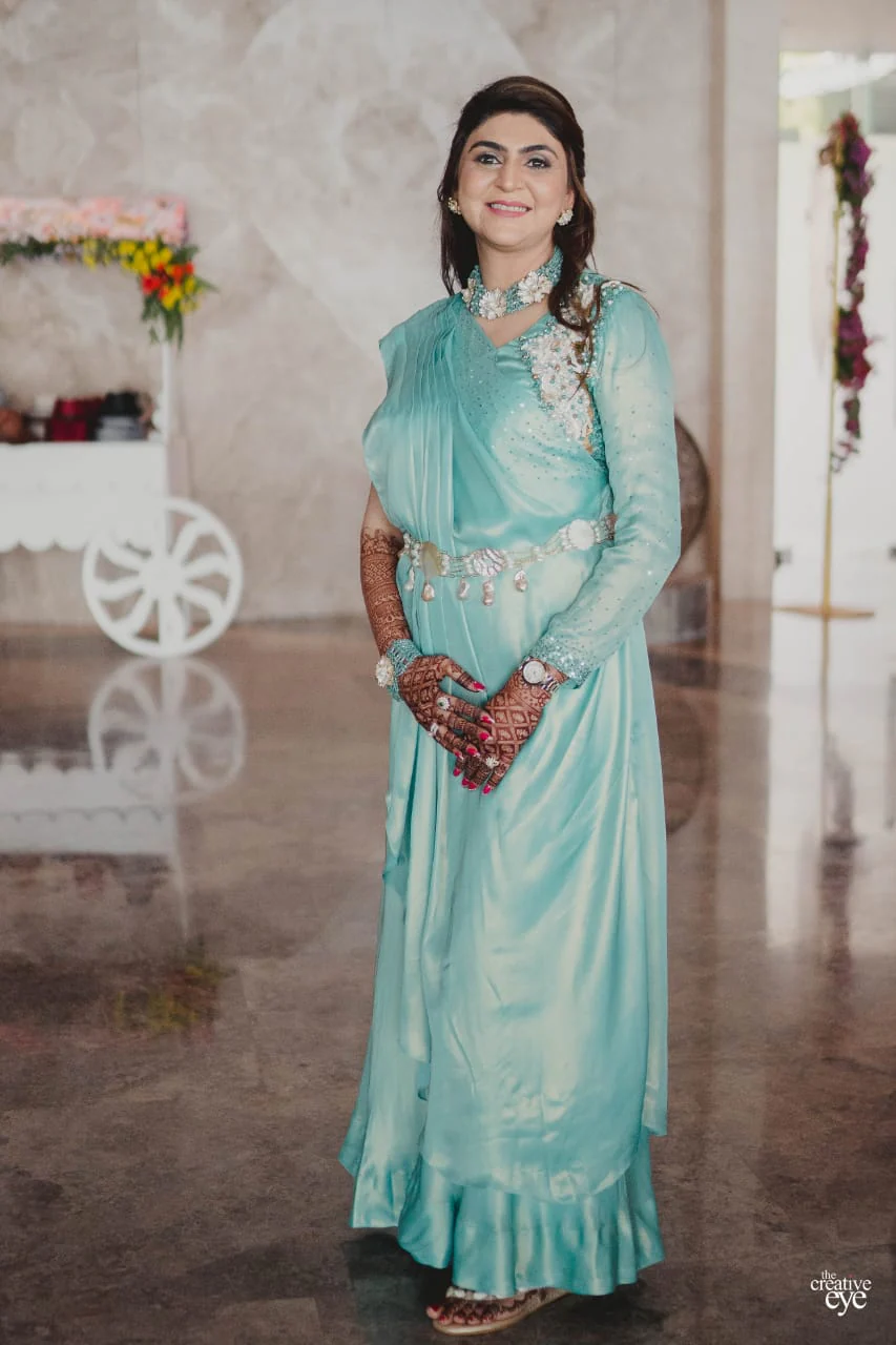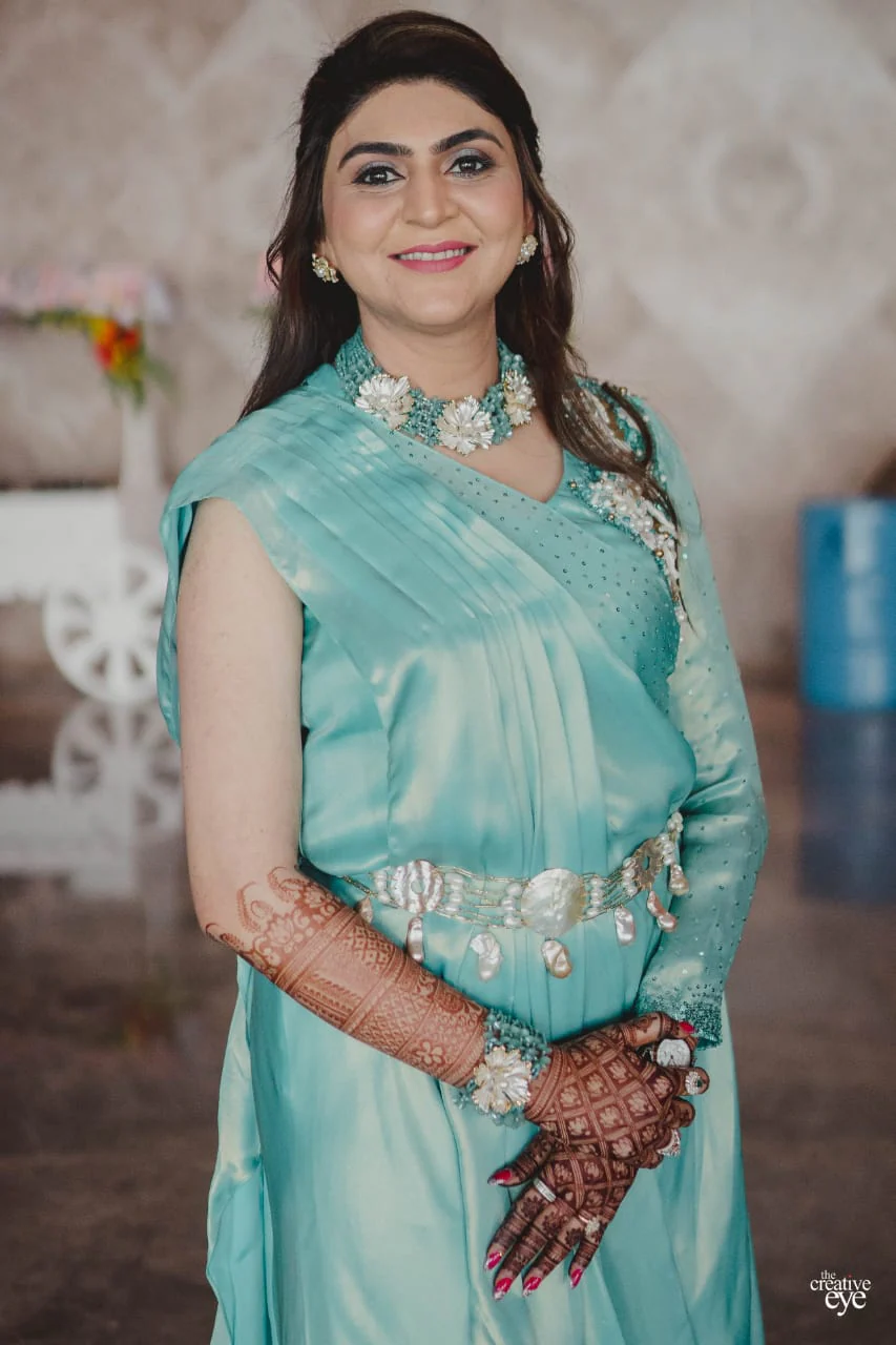 Our client wanted a fun and modern look for the pool-side sundowner. She had her jewellery in mind and wanted to curate an outfit around the same. We created this indo-western look to complement her accessories that had shell elements to fit into the Goa wedding. The outfit was a one-sided saree drape with a skirt, adding a fun and flowy element.