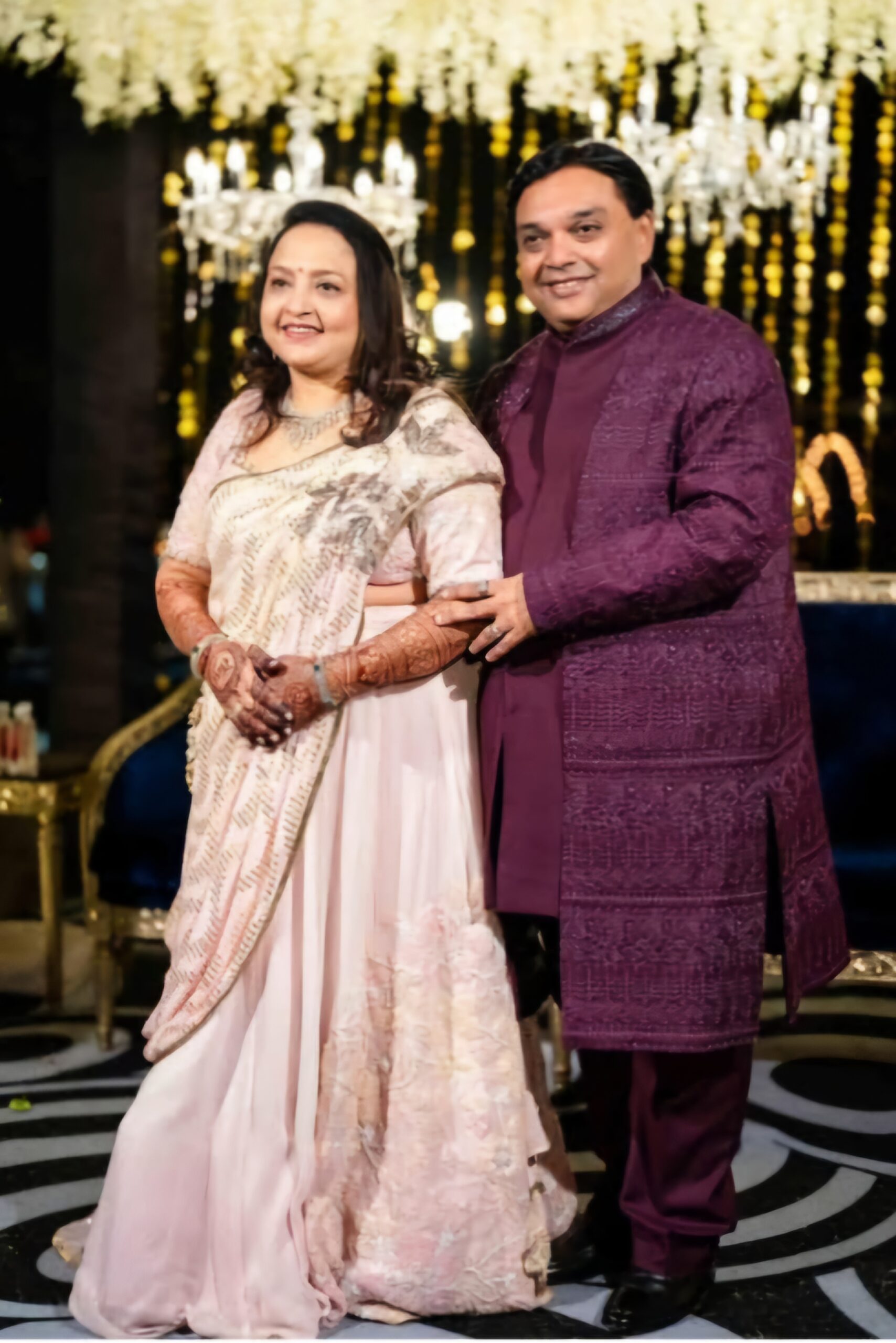 For her son’s sangeet, we’ve created a stunning pre-draped pink lehenga. The shaded shimmer fabric provides a graceful, flattering silhouette, while delicate hand embroidery along the side adds a touch of unique artistry.