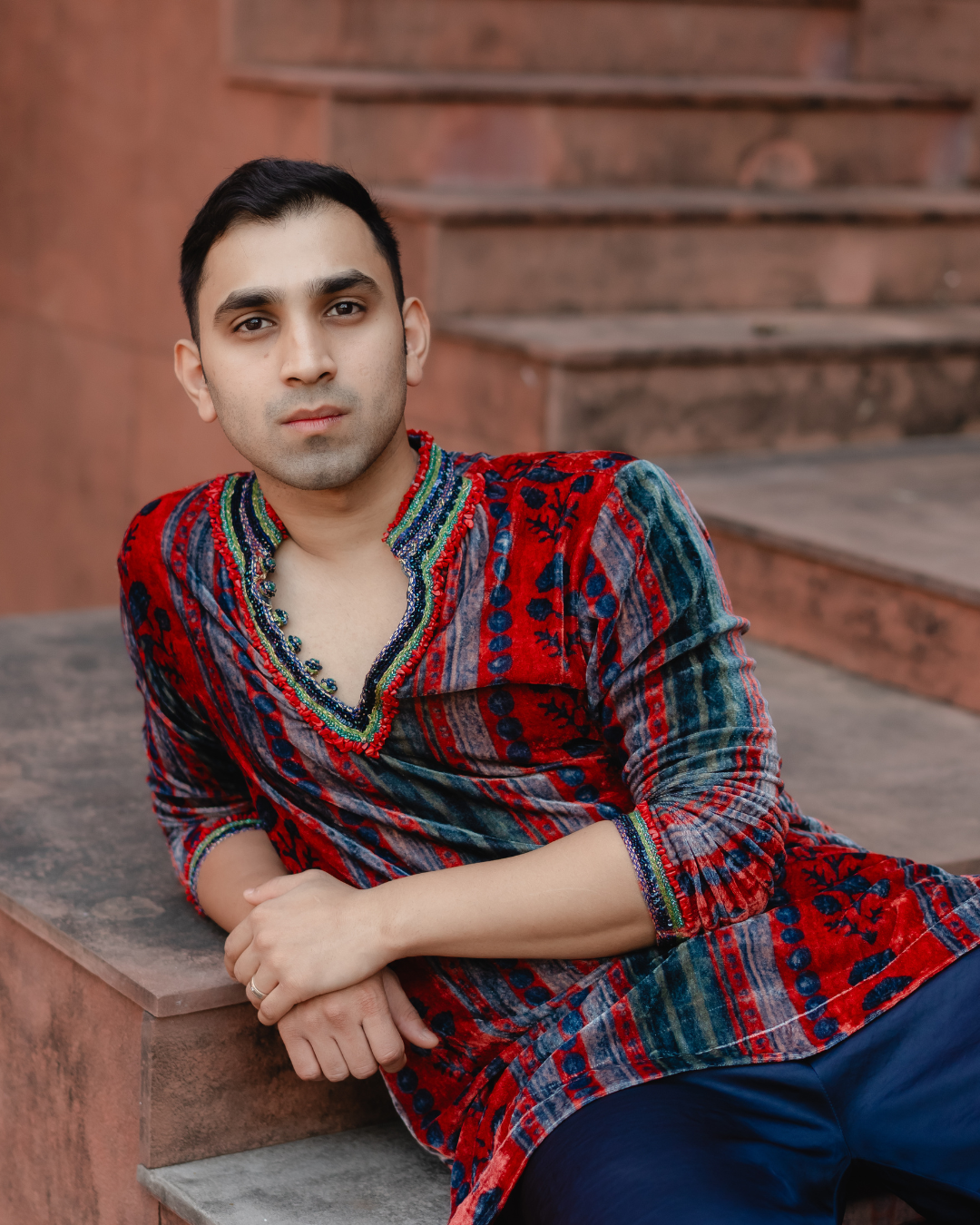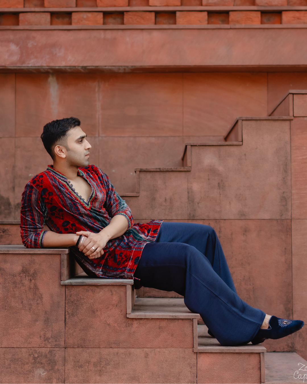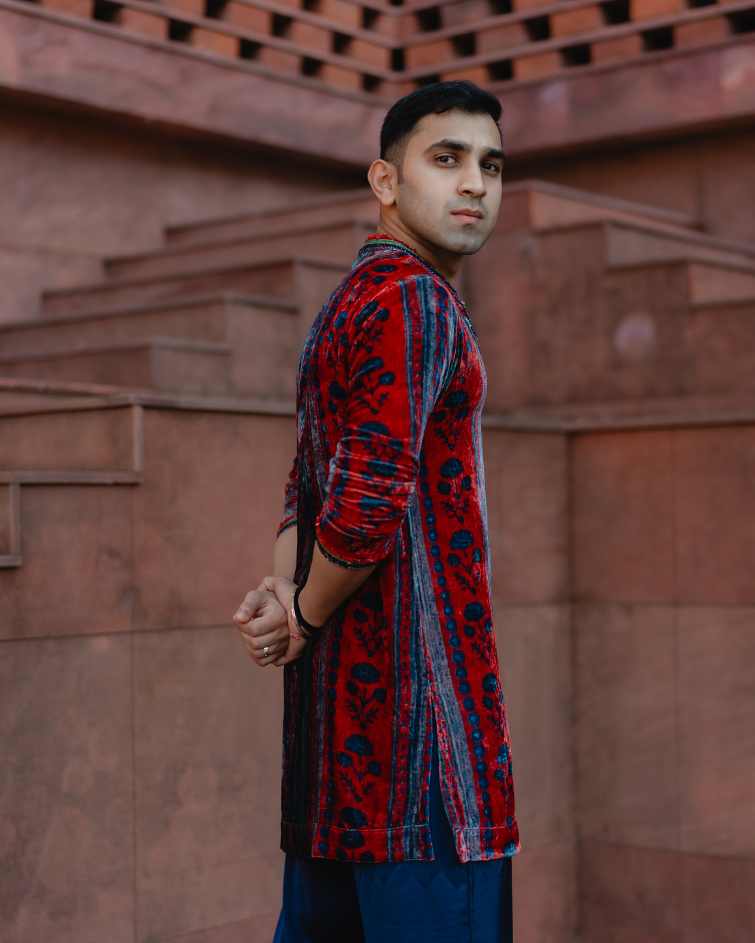 For our JV Groom, Dhrumil we designed an Ajrakh velvet kurta and paired it with wide-leg trousers. This custom ensemble created a refined, heritage-inspired look for his pre-wedding celebration.