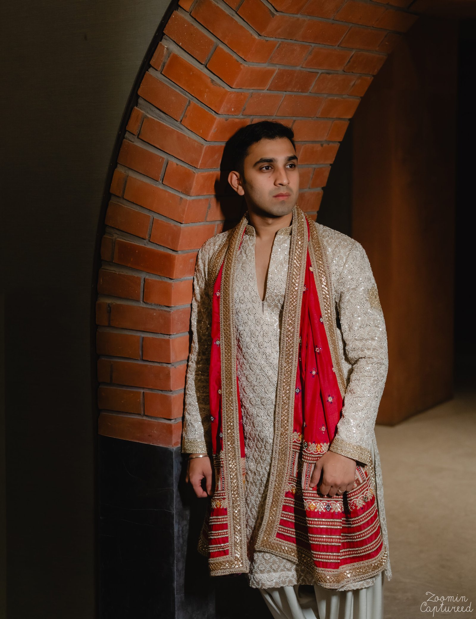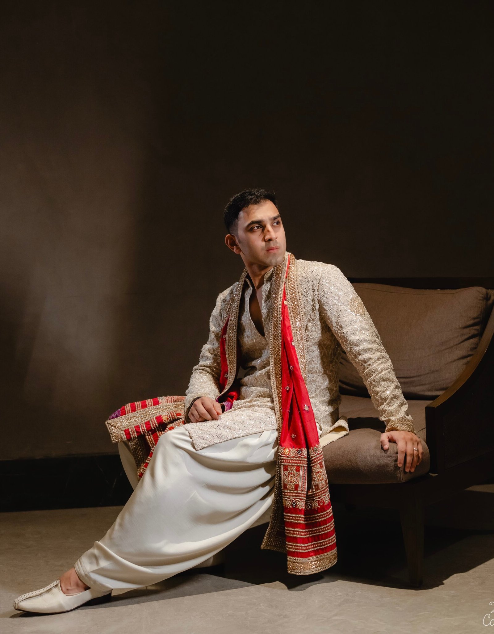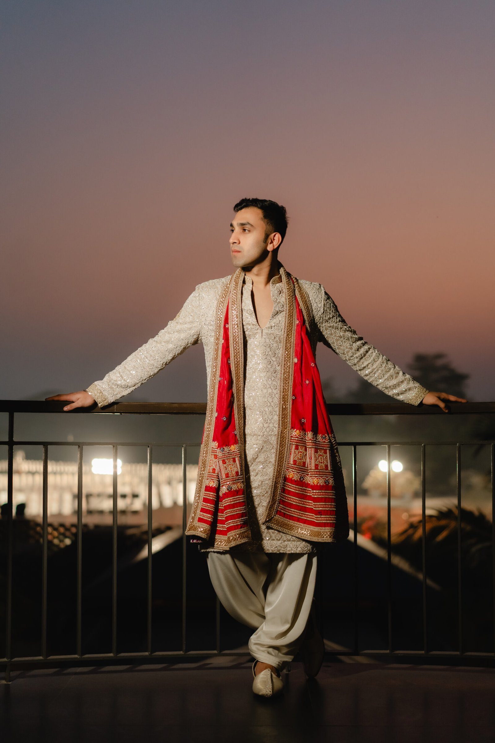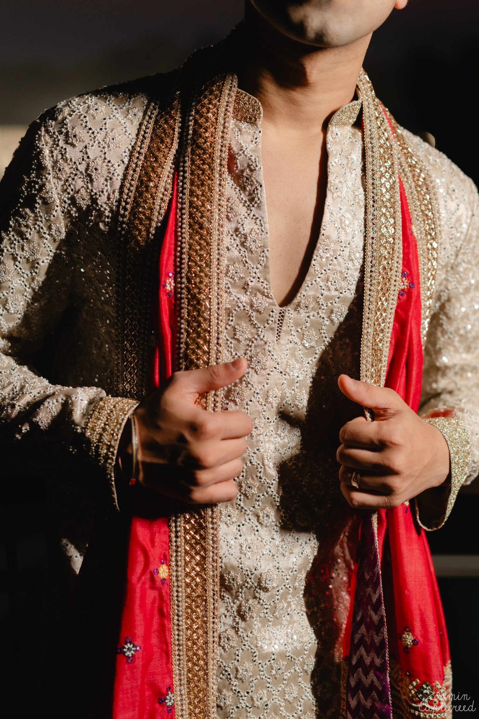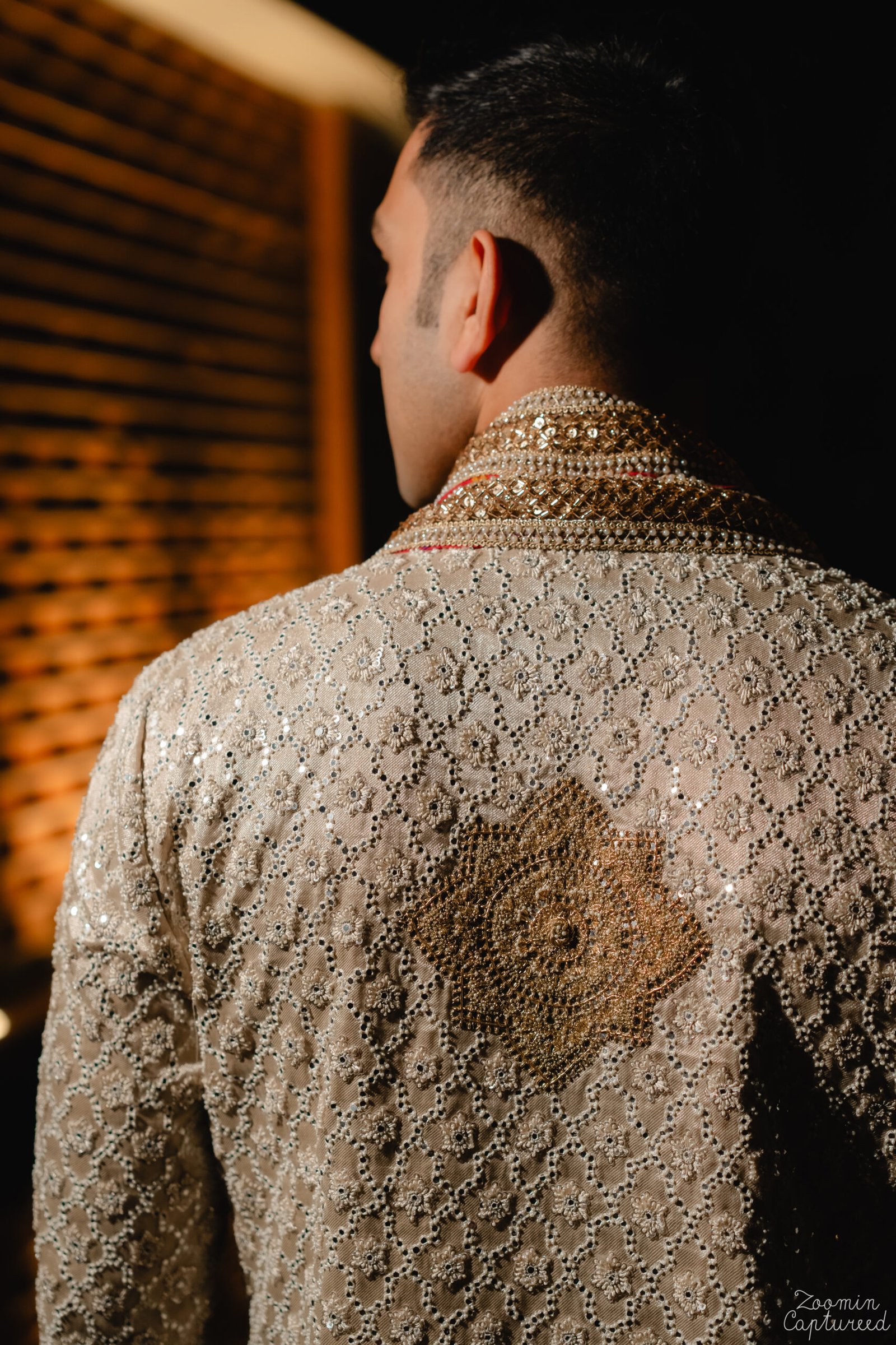 For our JV Groom, we designed a handcrafted off-white kurta set detailed with gold and silver zardozi. The back features a symbolic sun motif, adding depth and meaning to the piece. Finished with an Assamese stole, the look is rooted in heritage while carrying a refined, celebratory elegance.