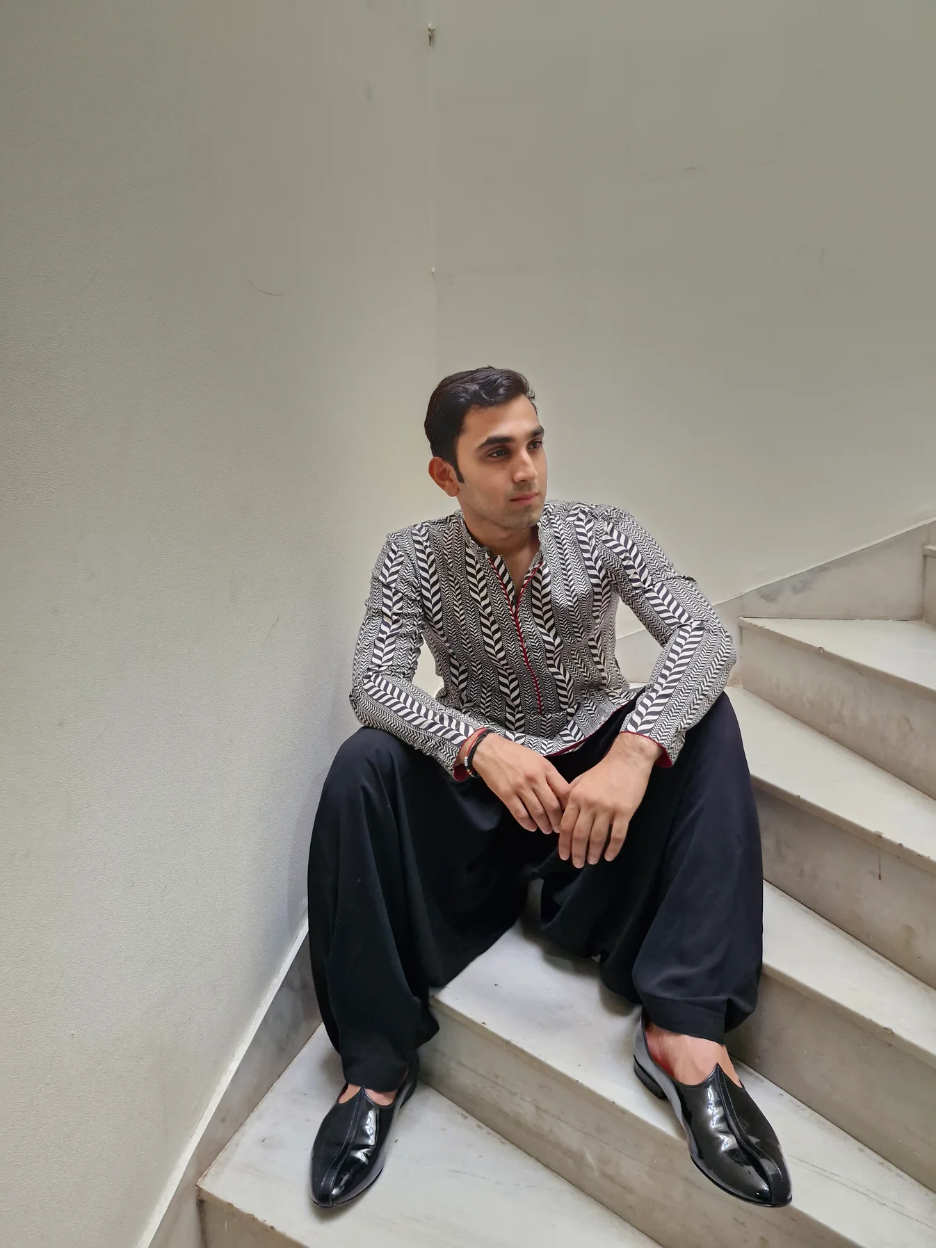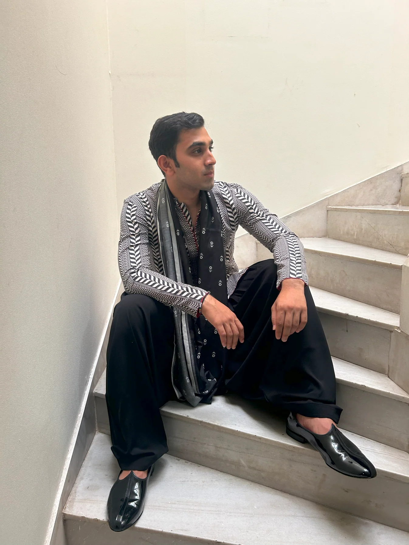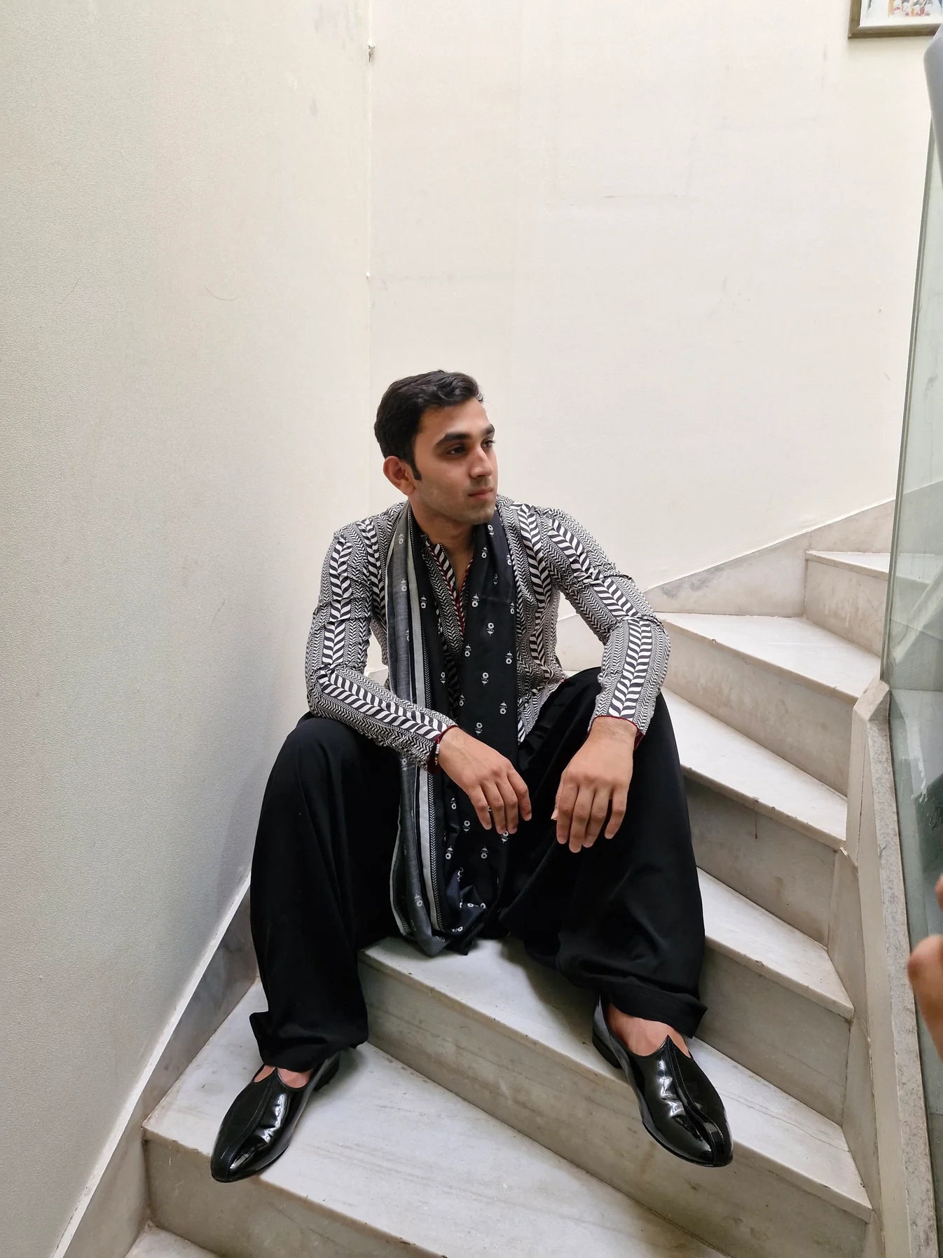 Our client approached us seeking an outfit that embodies comfort and simplicity for a special occasion. Taking into account his preferences, we curated a black kurta set with a printed design and a hint of red, paired elegantly with a stole for a stylish look.