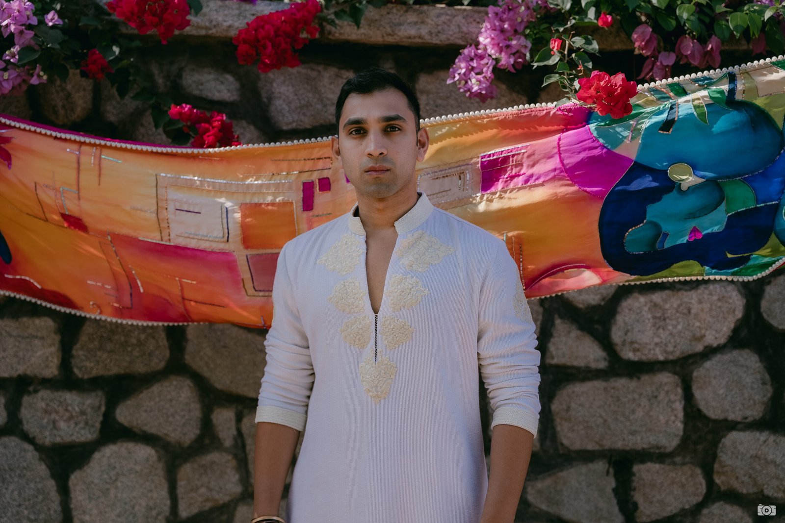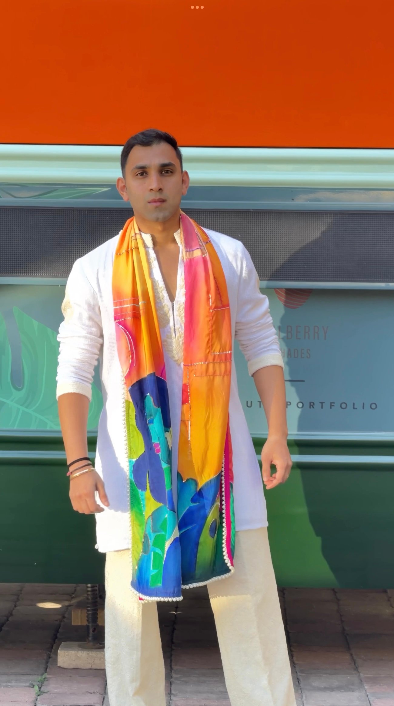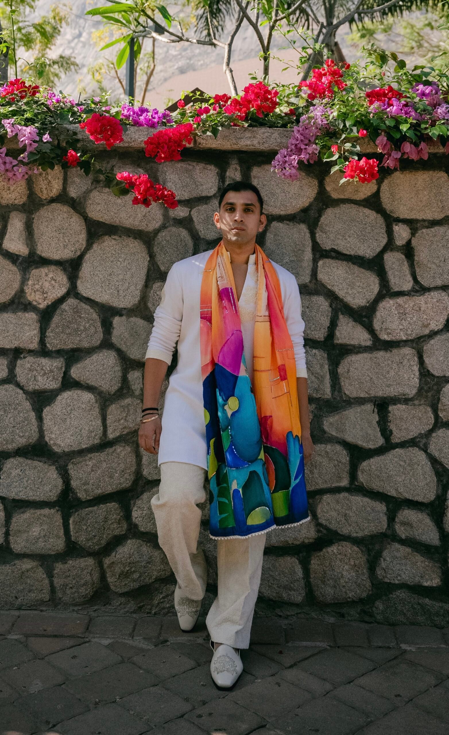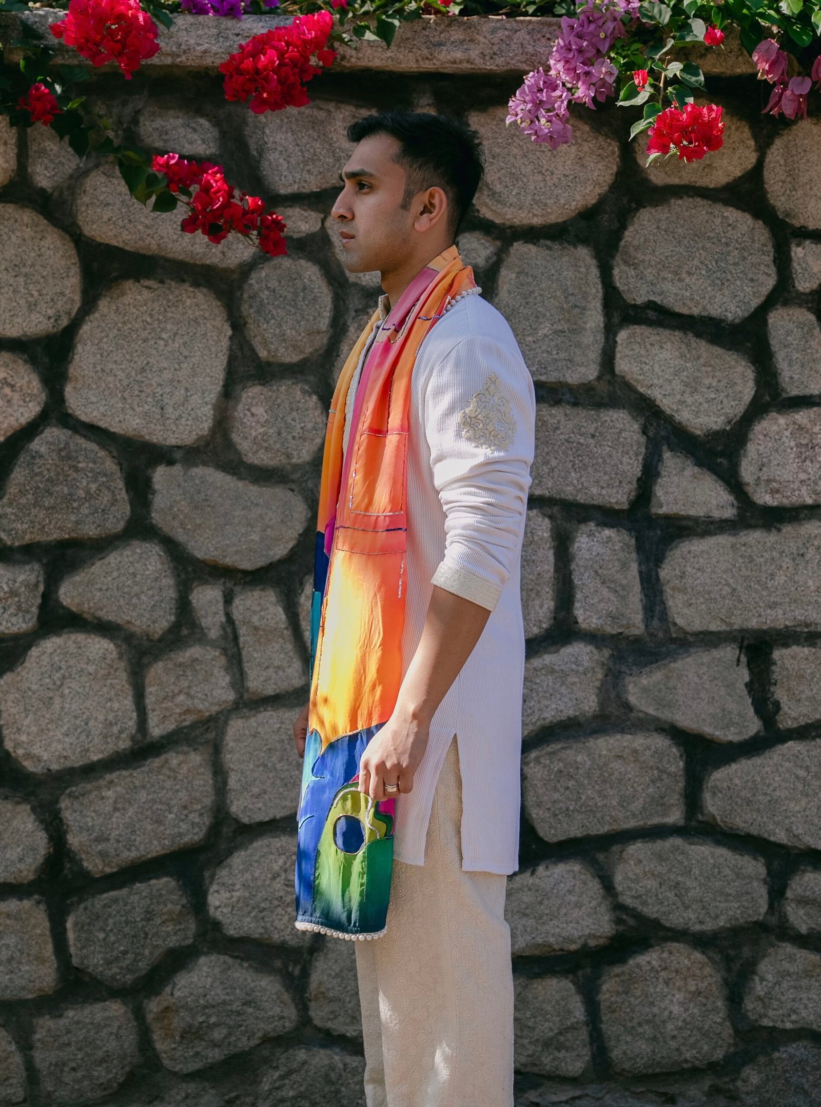 A monochrome ensemble crafted for effortless elegance, featuring a textured kurta with subtle neckline detailing. It was paired with relaxed trousers for a modern silhouette. The look is completed with a hand-painted stole, adding an expressive, artisanal touch.