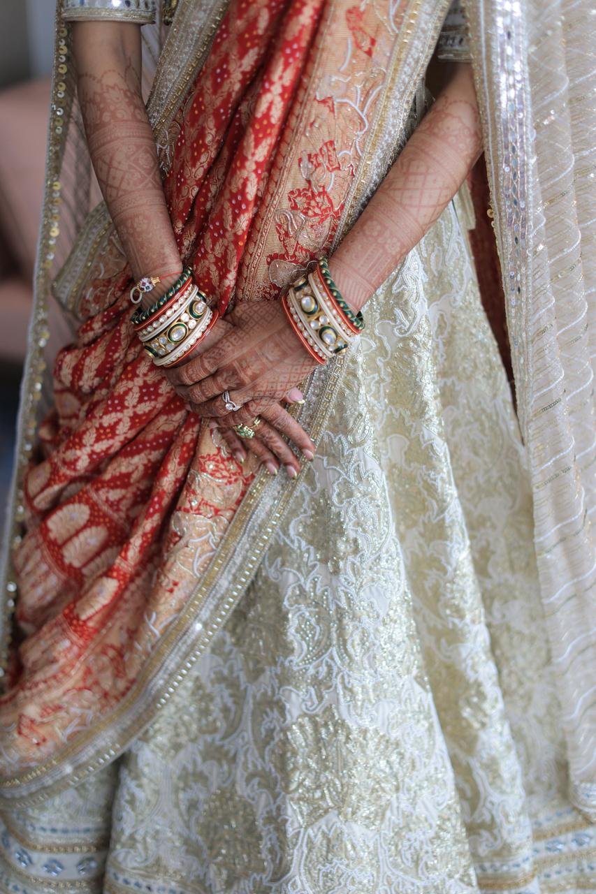 For our JV Bride’s Phera, we crafted a Banarasi lehenga in soft off-white, blending contemporary elegance with tradition. Her red Bandhani dupatta paid tribute to her Gujarati roots, draped gracefully over her shoulders.
