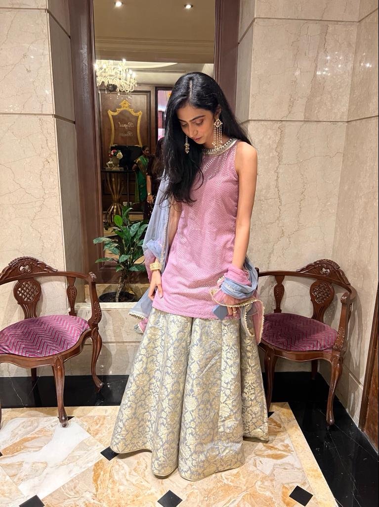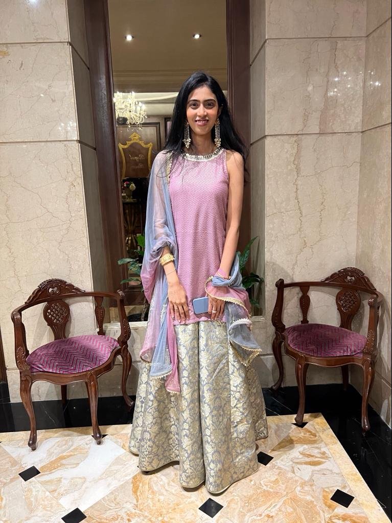 We created a contemporary bridesmaid look by designing a rich purple kurta paired with elegant Banarasi palazzos, resulting in a perfect blend of modern style and traditional charm.