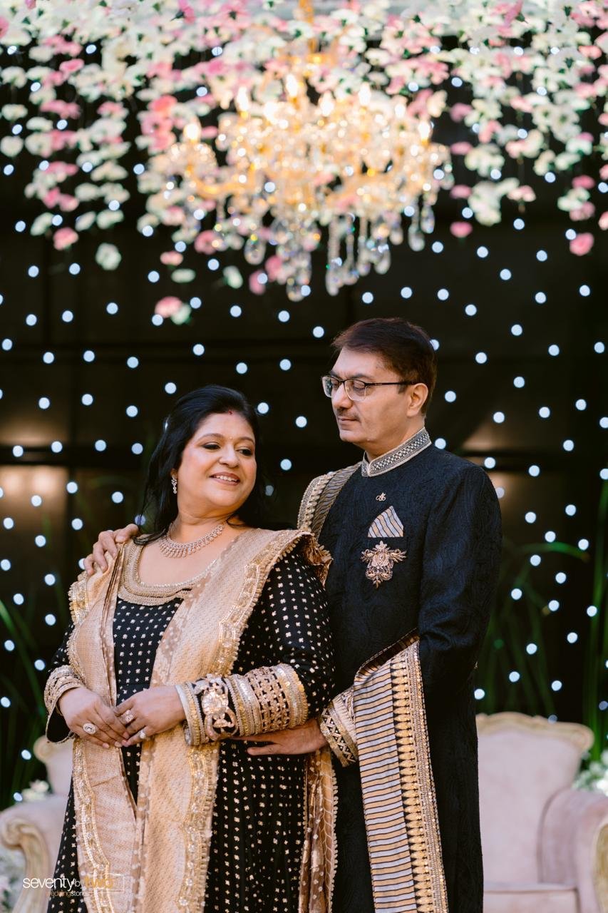 A Banarasi Anarkali with a copper-gold Banarasi tissue saree, styled in a double-sided drape for her son’s reception.