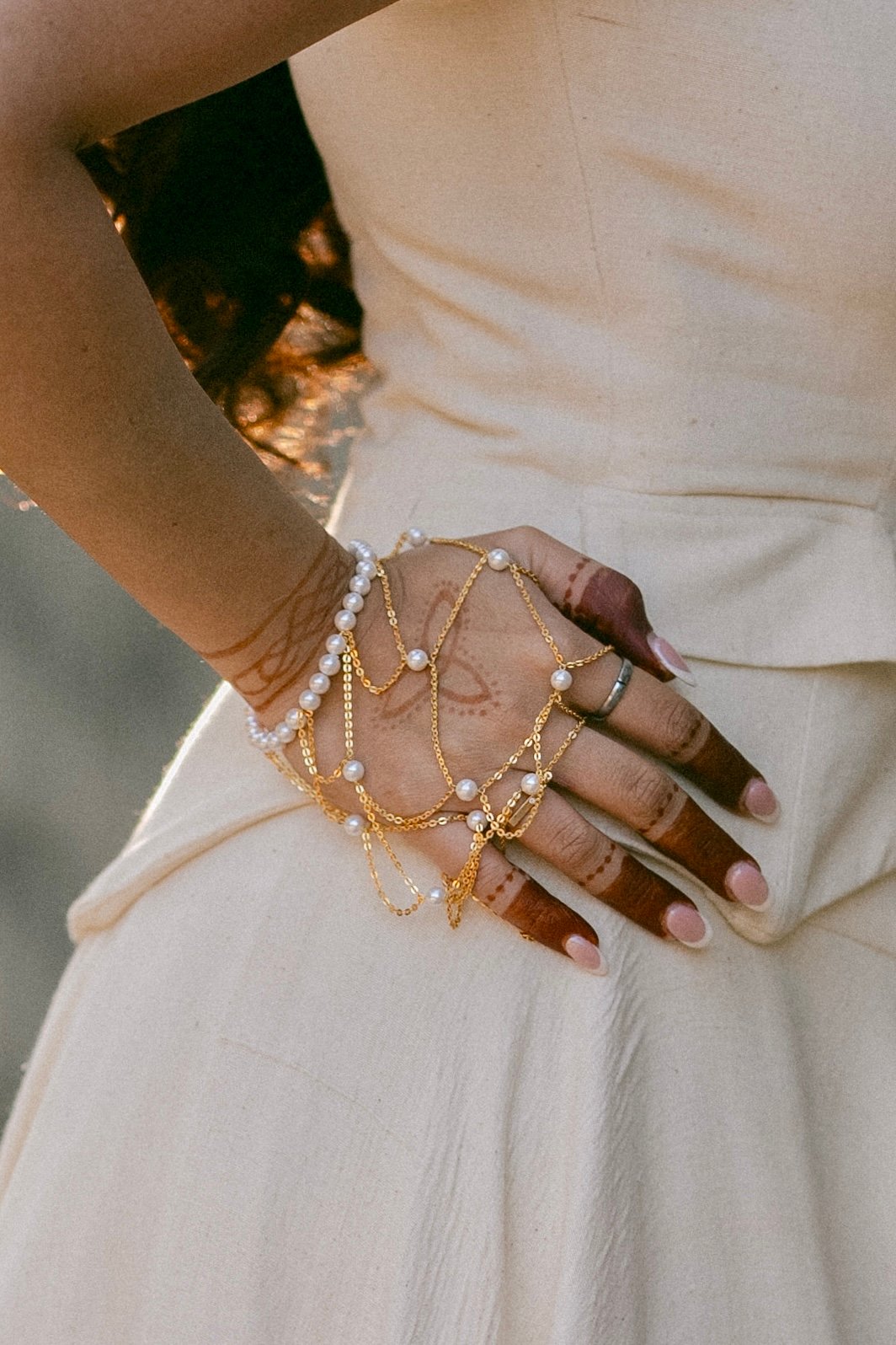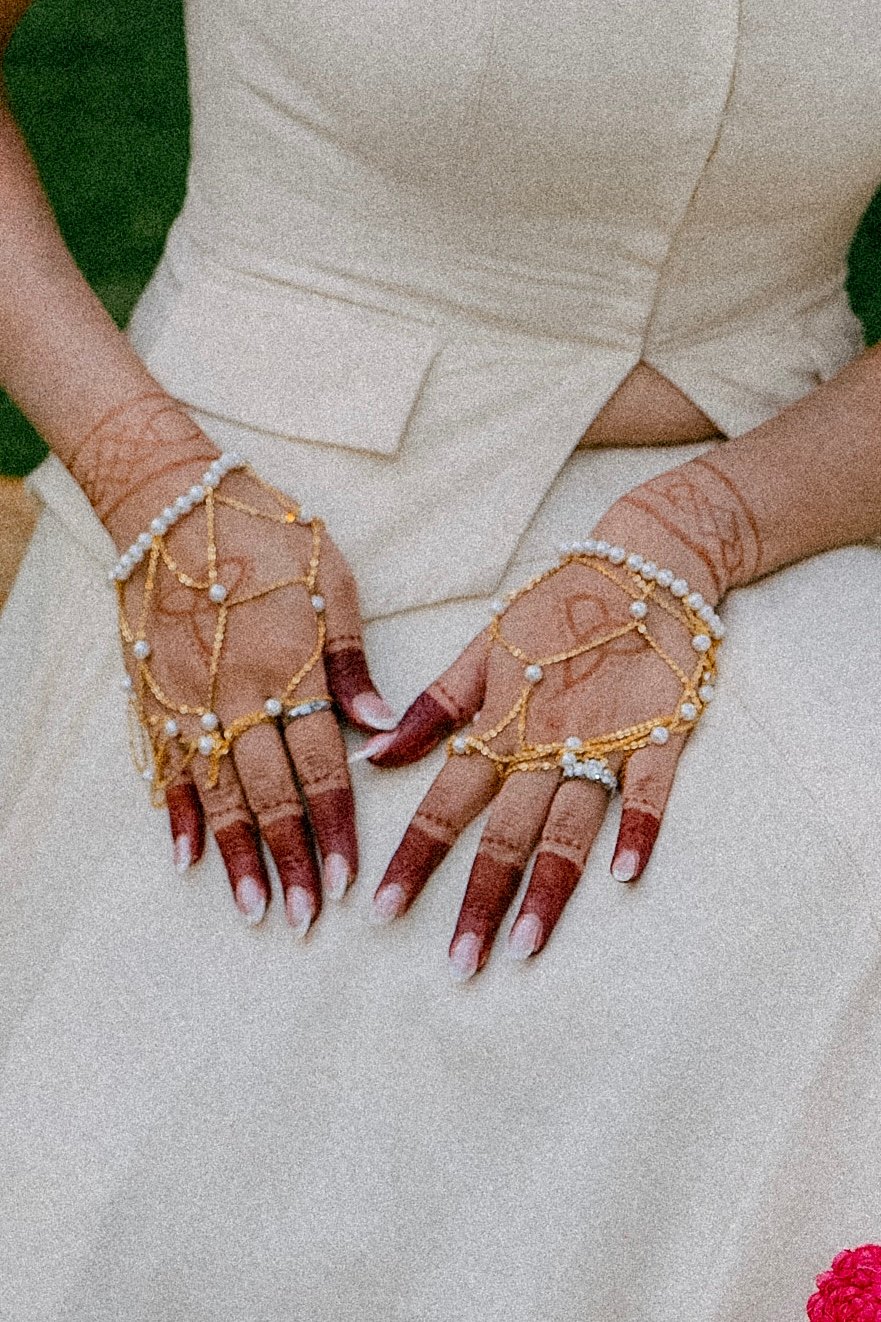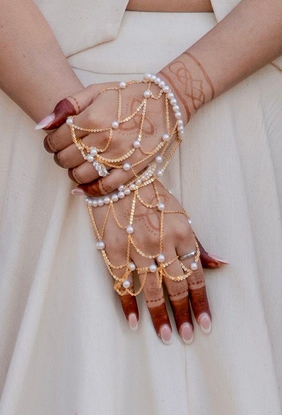 This delicate haath phool is crafted in sterling silver with a gold-plated finish, adorned with lustrous pearls. Designed with fine chains that drape gracefully across the hand, it brings a soft, understated charm to the look—perfect for effortless, modern-day tradition.