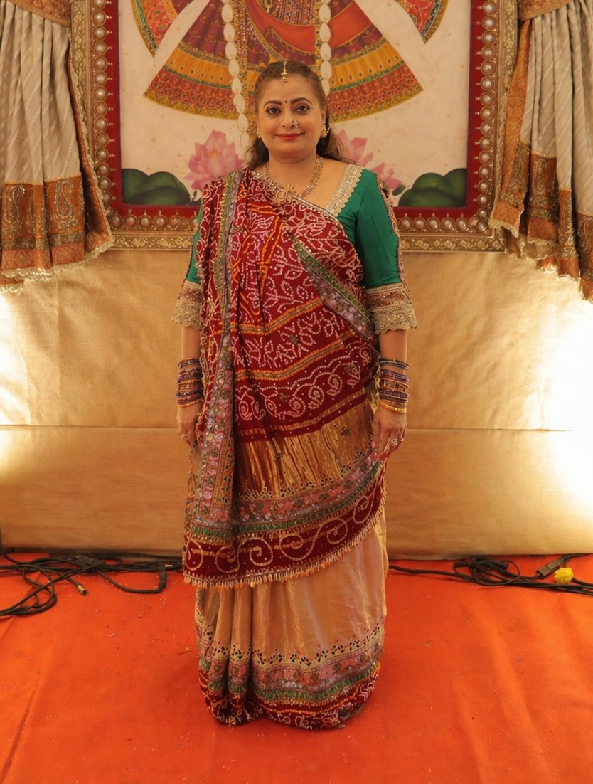 For our JV Mother, we reworked her original wedding saree into a timeless heirloom—an intricate blend of Bandhani and Gharchola, enriched with delicate zari work, thoughtfully revived while preserving the art form.