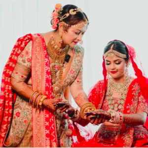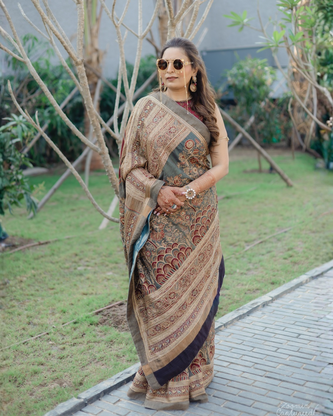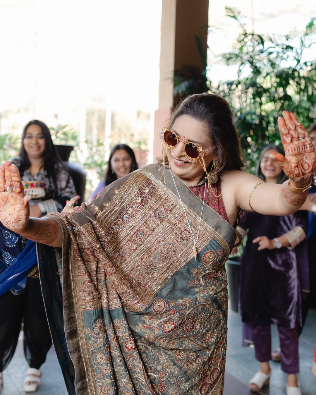 Our co-founder wore a signature JV Airakh saree with intricate hand embroidery, paired with custom jewellery by Jesal Vora Jewels. A look perfect for the pre-wedding celebrations.