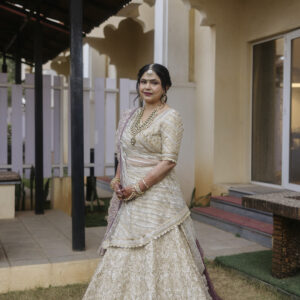 For our Principle Designer, every creation is a reflection of emotion, and this one was truly special. For her daughter’s Goldhana, Jesal Vora wore her signature JV khadi lehenga set in serene hues of blue, paired with a hand-embroidered banarasi dupatta and an intricately detailed blouse.
