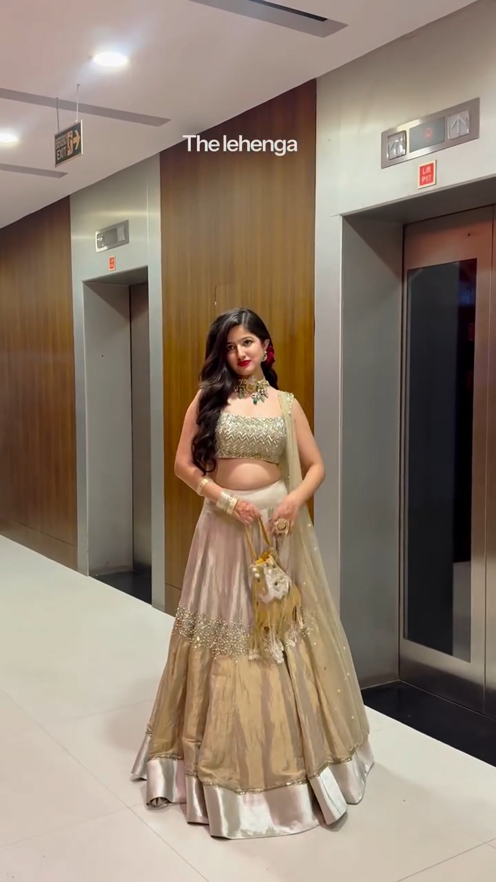 Graceful and beautiful Jhanvi Bhatia in a Banarasi tissue silk lehenga paired with a chevron-embroidered blouse for an elegant and sophisticated look.