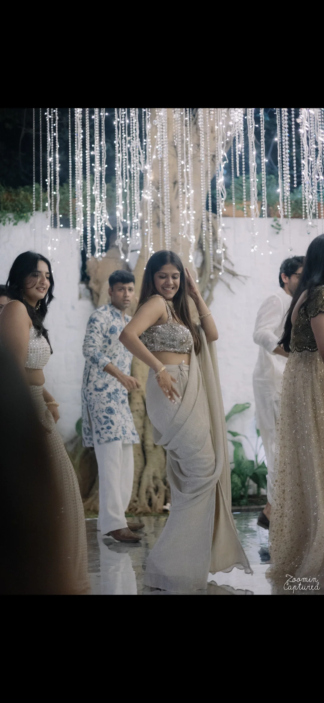 For our clients friend’s Goldhana, we styled her in a JV champagne pre-draped saree with a handcrafted blouse perfect to dance the night away!