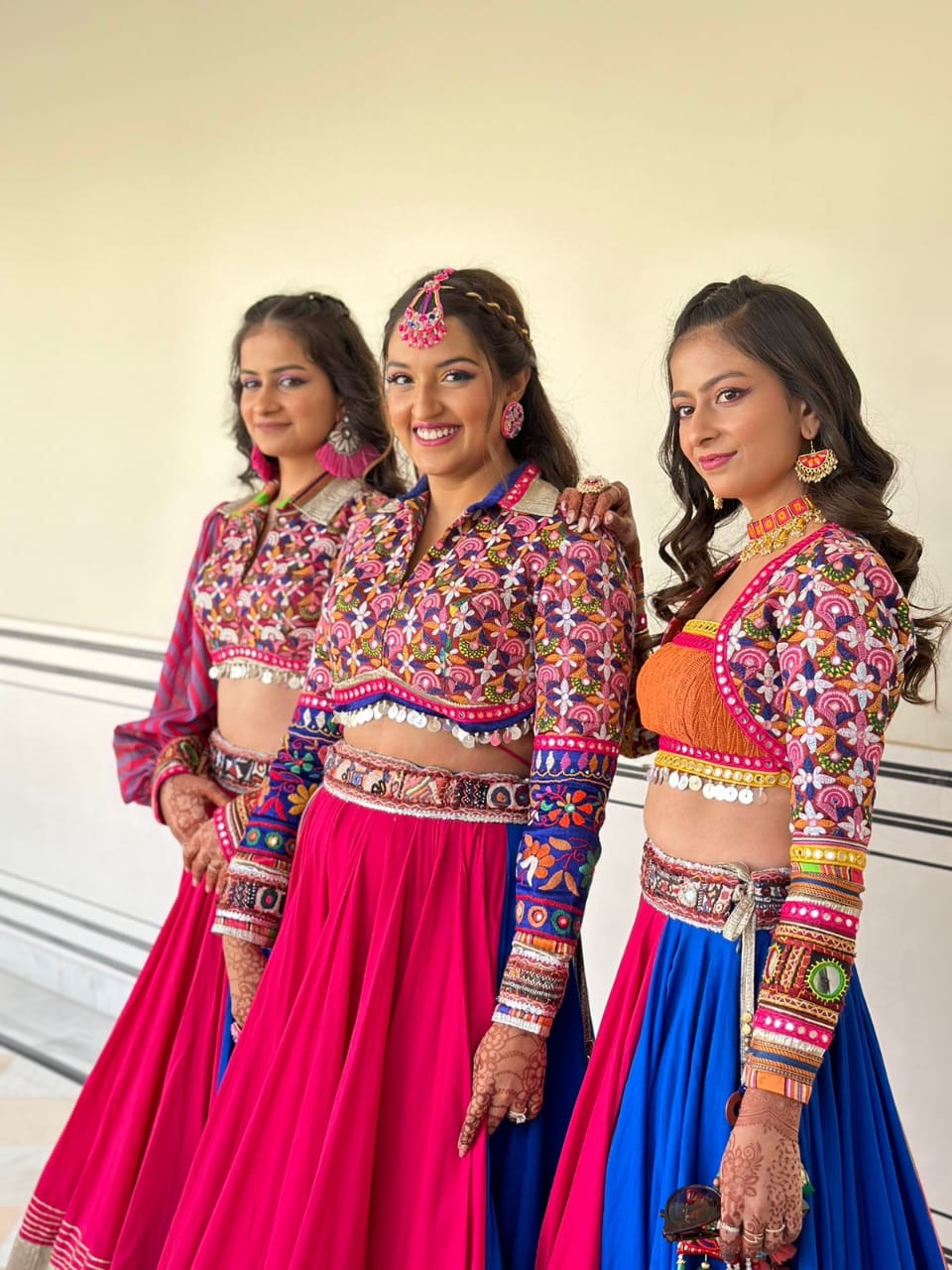 For our brides raas-garba function, we created this gorgeous look with hand-embroidered resham. We added a touch of uniqueness to her look, by adding 3 different coloured panels in her lehenga, allowing it to be a new look everytime she wore it. We paired it with a contemporary collared blouse, crafting a distinctive look.