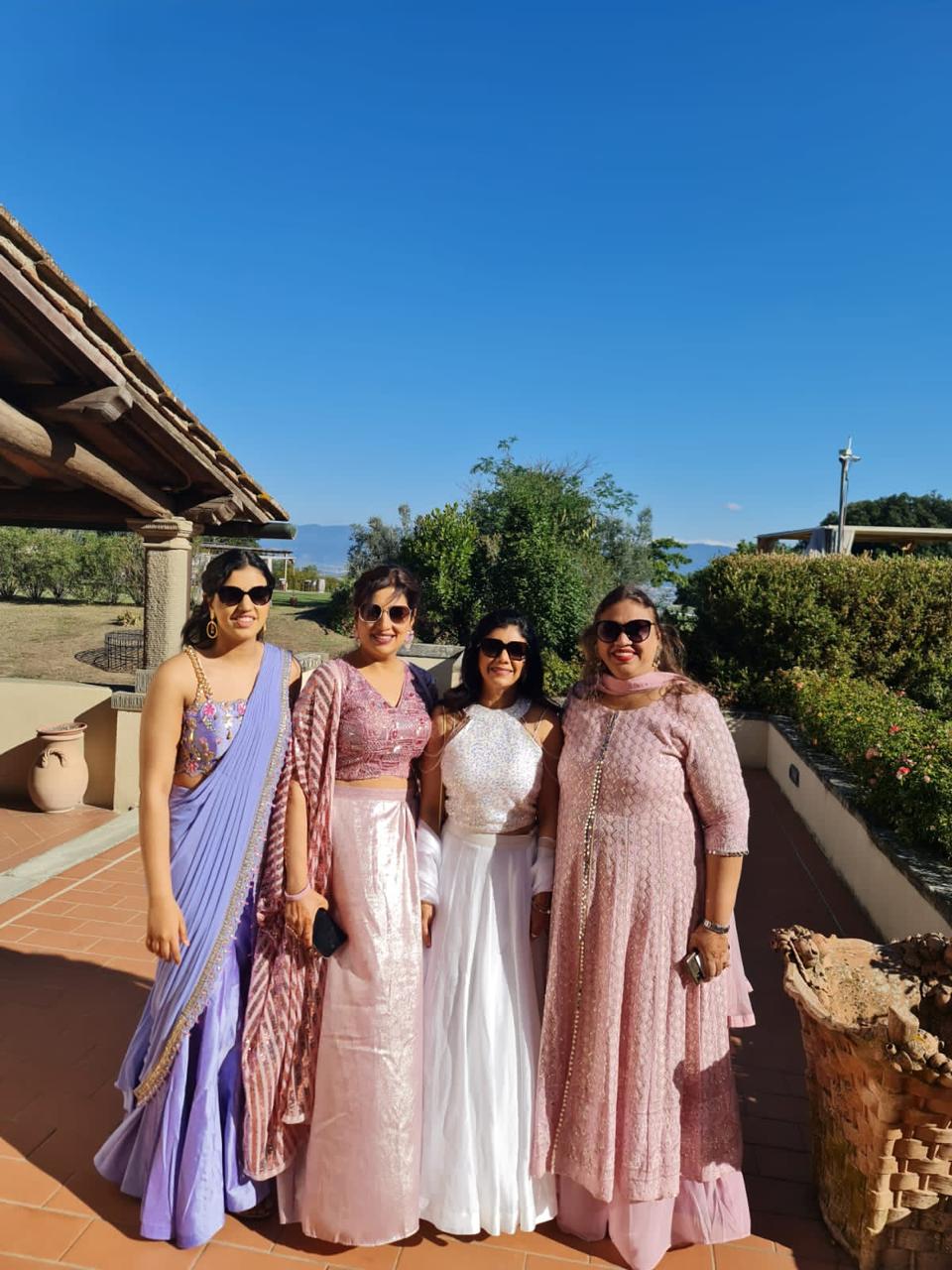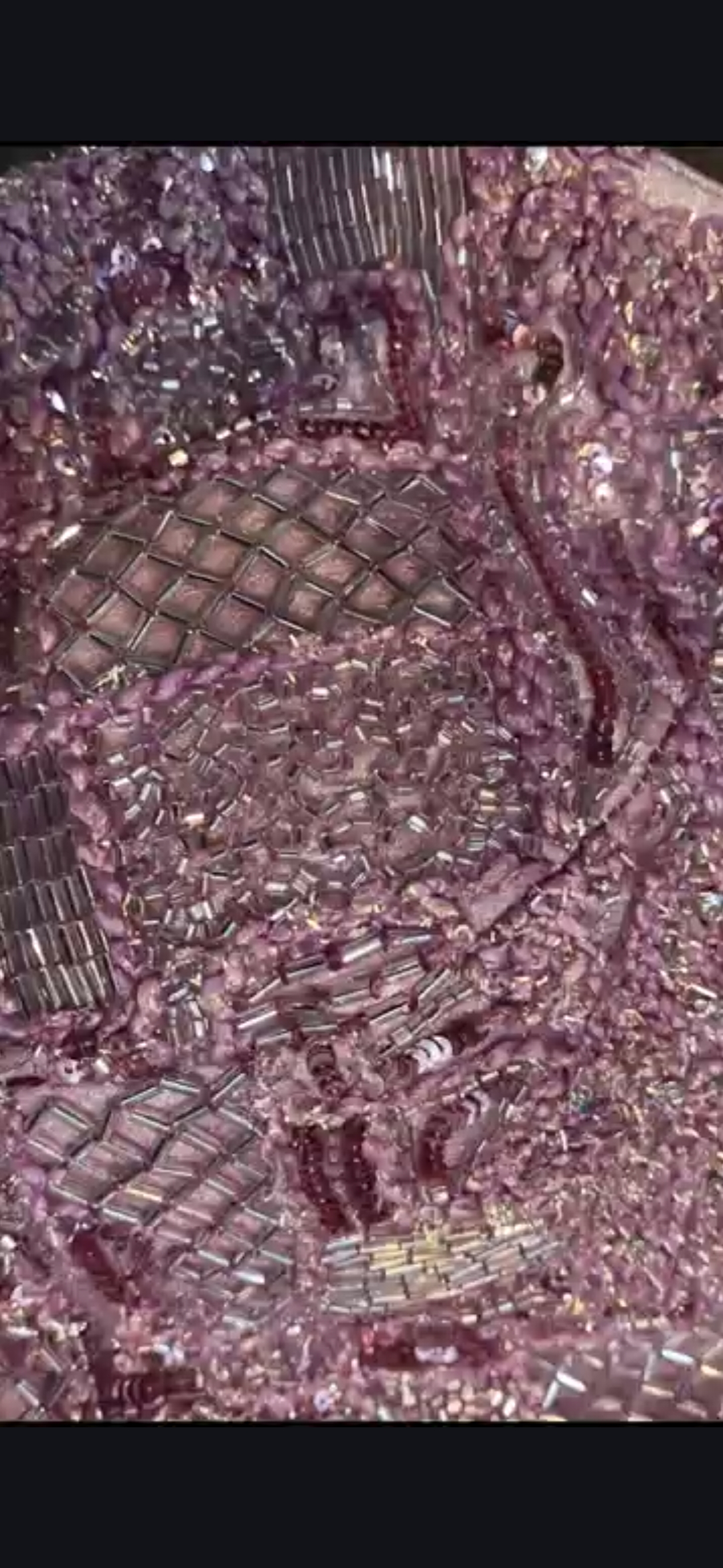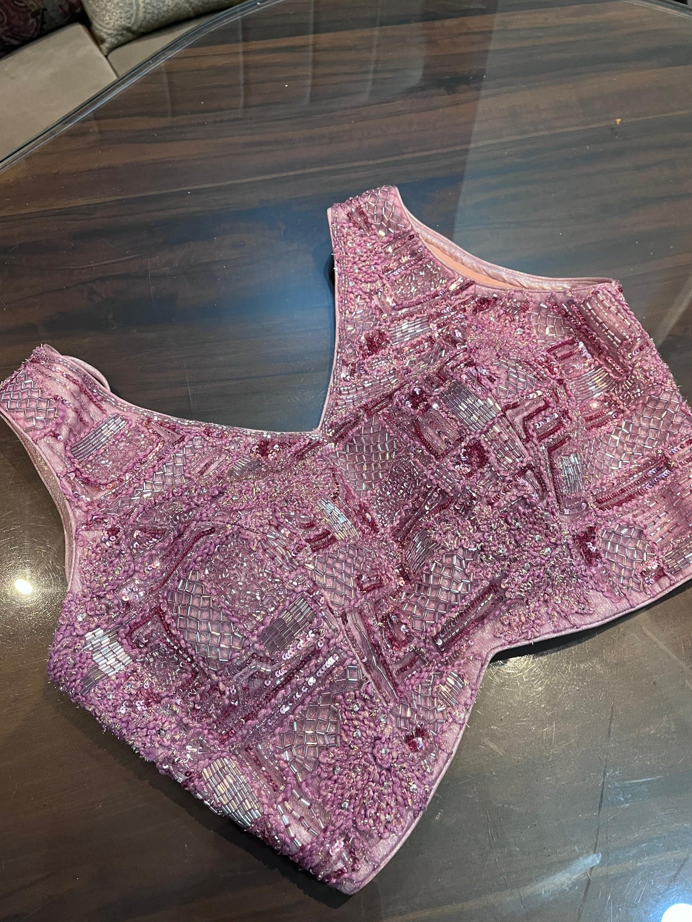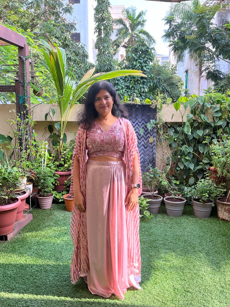 We created this stunning monochrome look for our client, with a hand-embellished blouse and a cape. We chose a shade of pink that perfectly reflected her personality and complemented her body and skin type.