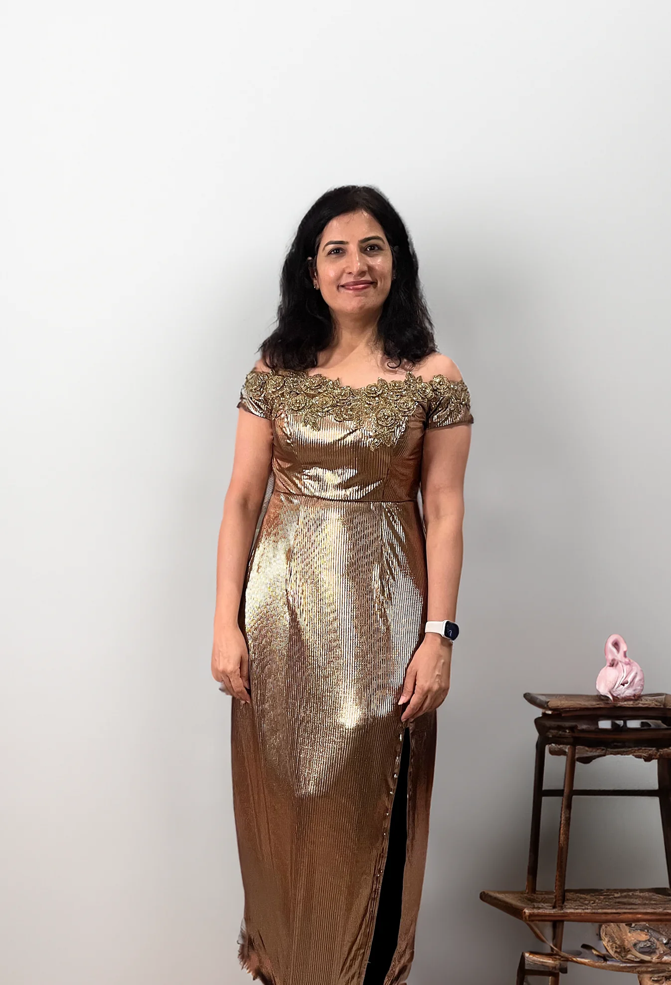 Our client was looking for a contemporary outfit for a formal reception, being held in London. We curated this stunning copper gown with floral handwork that complemented her body type and personality!