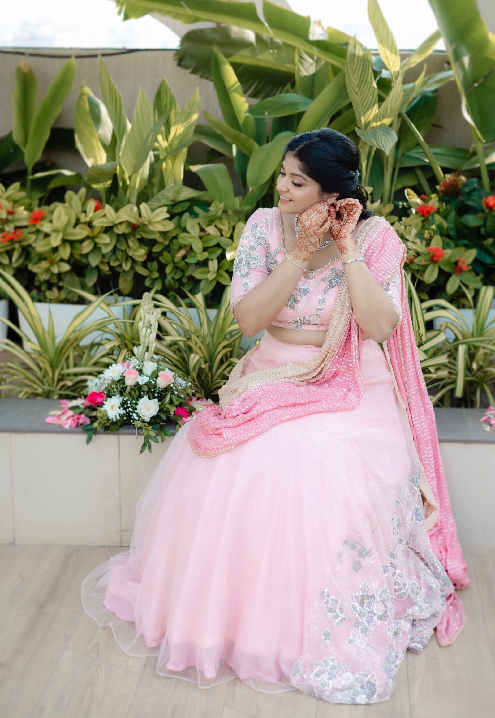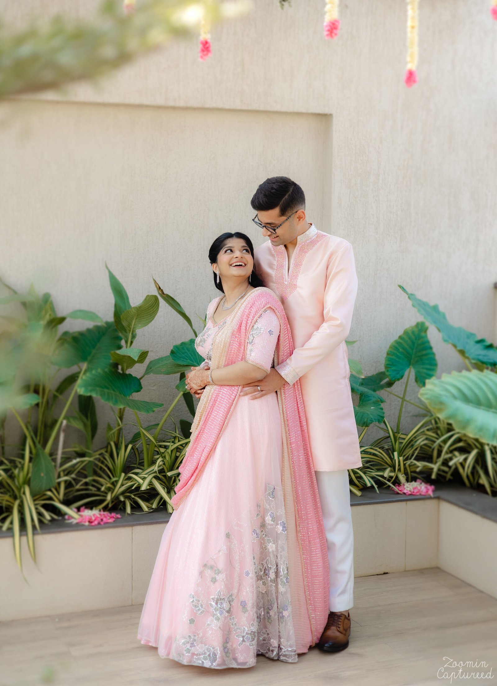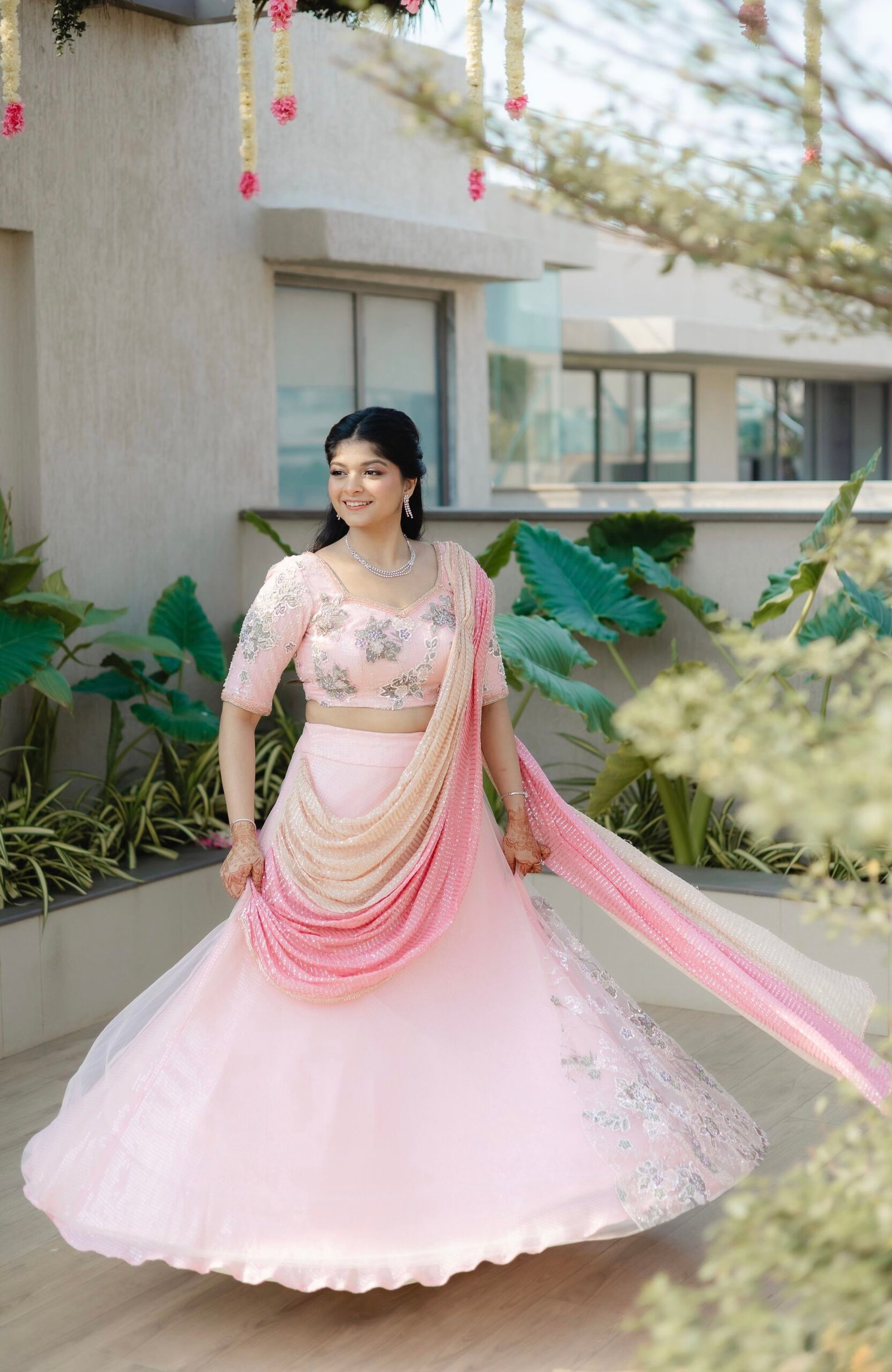 For our JV Bride we designed a pre-draped lehenga set with one-sided embroidery, perfect for her morning Roka Ceremony.