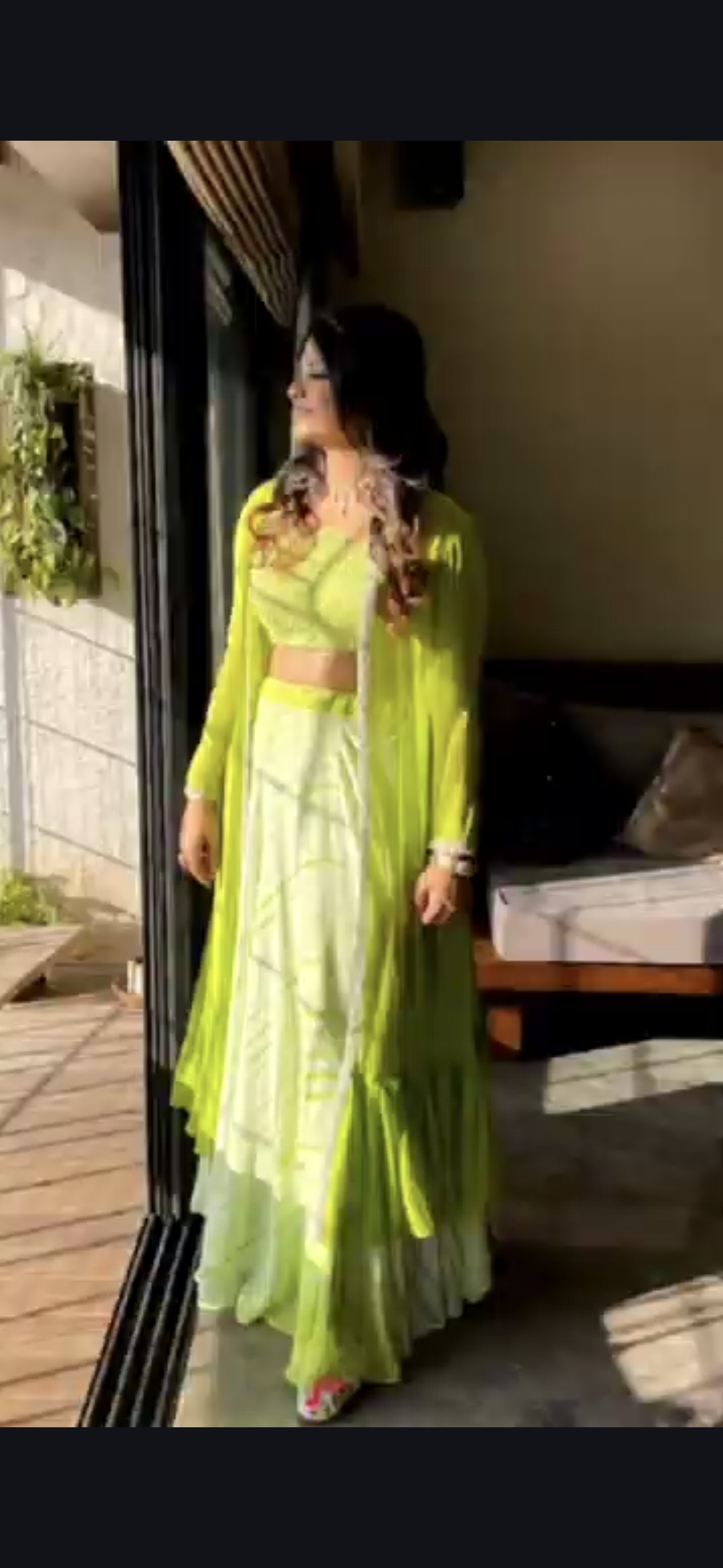 We crafted this beautiful shibori tie-dye georgette lehenga for our client with a floral crochet blouse, for a mehendi funciton.