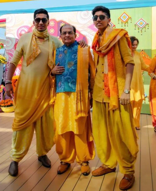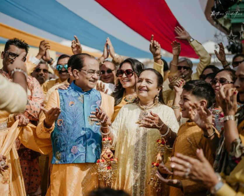 For our client’s 60th wedding anniversary haldi ceremony, we tailored a stunning Banarasi kurta set, with a hand painted Krishna figurine jacket. This ensemble radiates vibrancy and elegance, commemorating their special milestone with style.