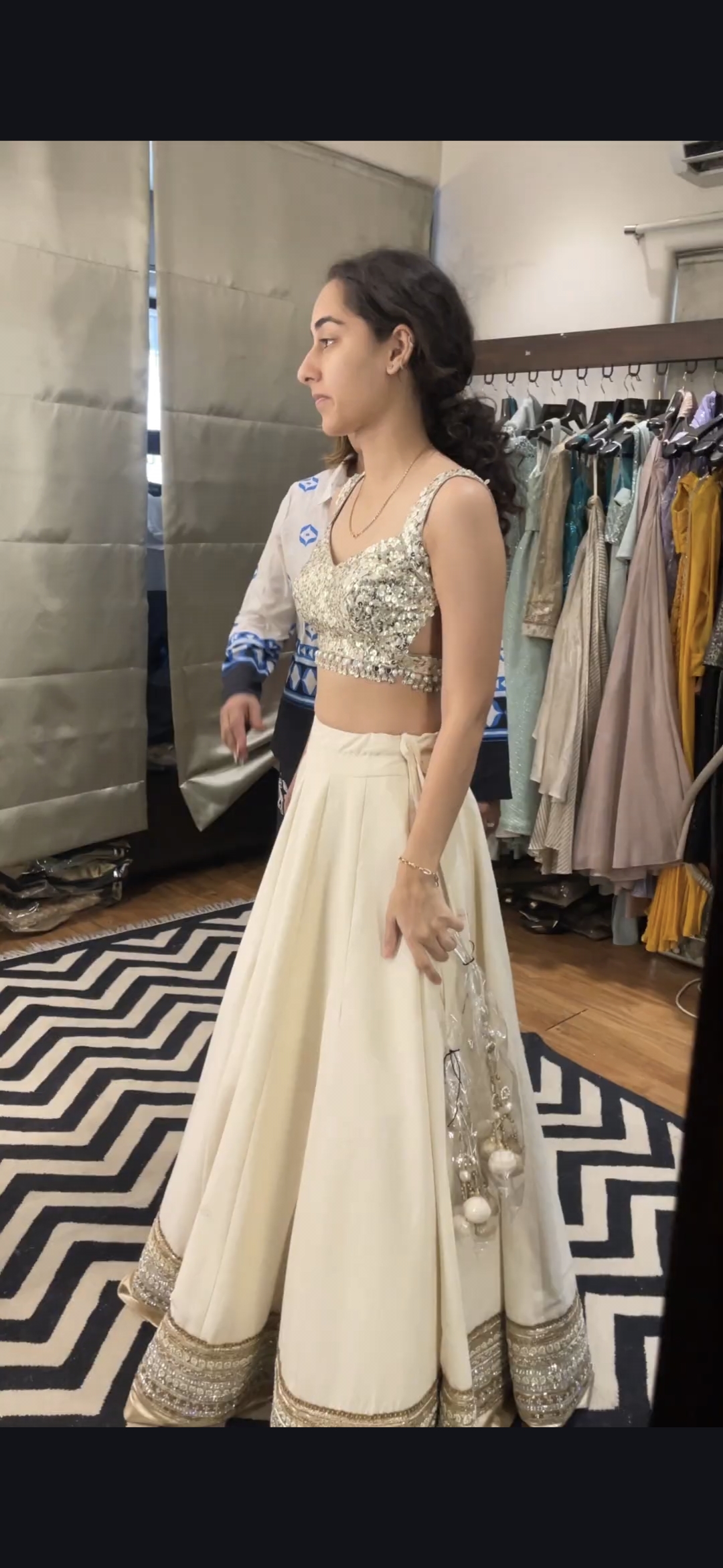 One lehenga, two vibes! For our bridesmaid, we created a signature JV khadi lehenga in off-white with intricate hand embroidery at the bottom—paired with two blouses for a switch between classic elegance and contemporary chic.