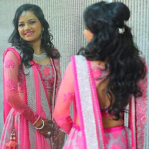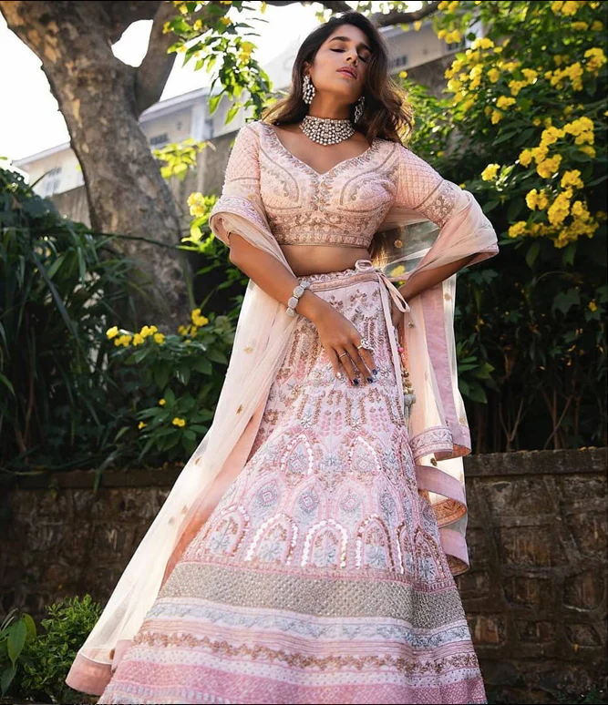 Our client was looking for a soft-hued lehenga with hand-embroidery. We created this alluring blush pink lehenga with a mix of geometric and floral embroidery, with resham and zardozi embroidery.