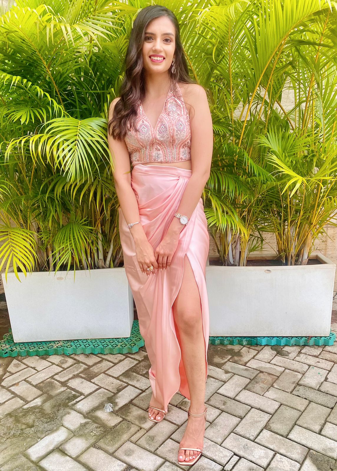 Our client wanted a contemporary look for a formal sit-down dinner and was looking for a versatile and contemporary look. We chose this blush pink shade to complement her skin tone and curated this look with a halter blouse and a draped skirt with a striped organza jacket. The look also featured resham zardozi handwork with floral and geometric embellishment.