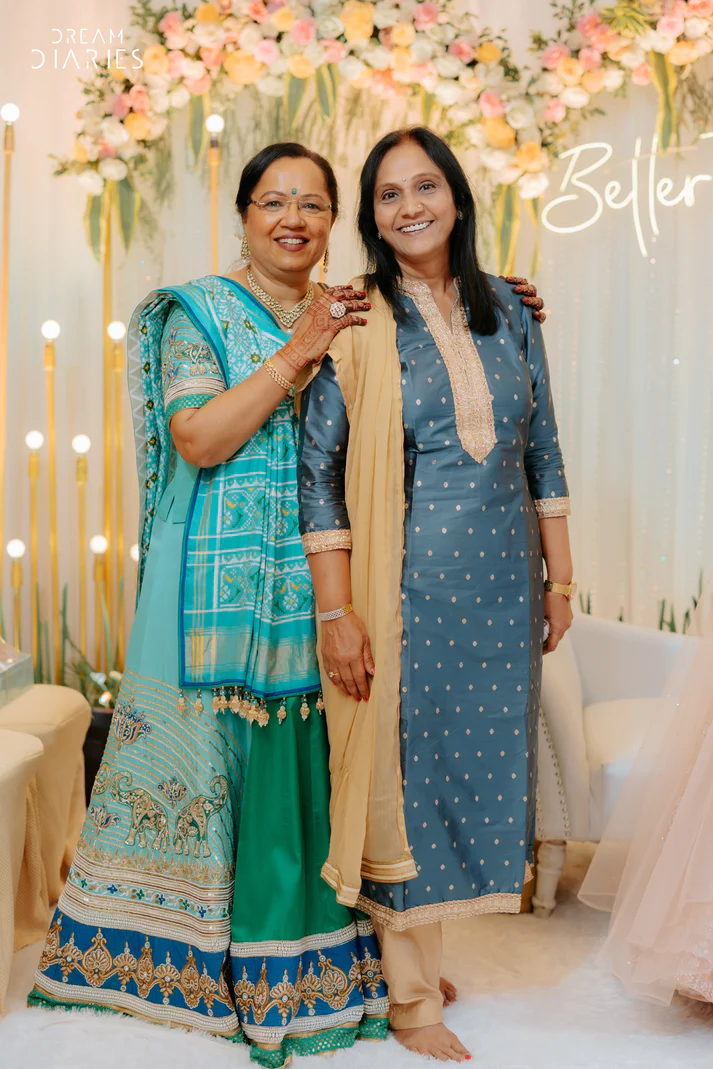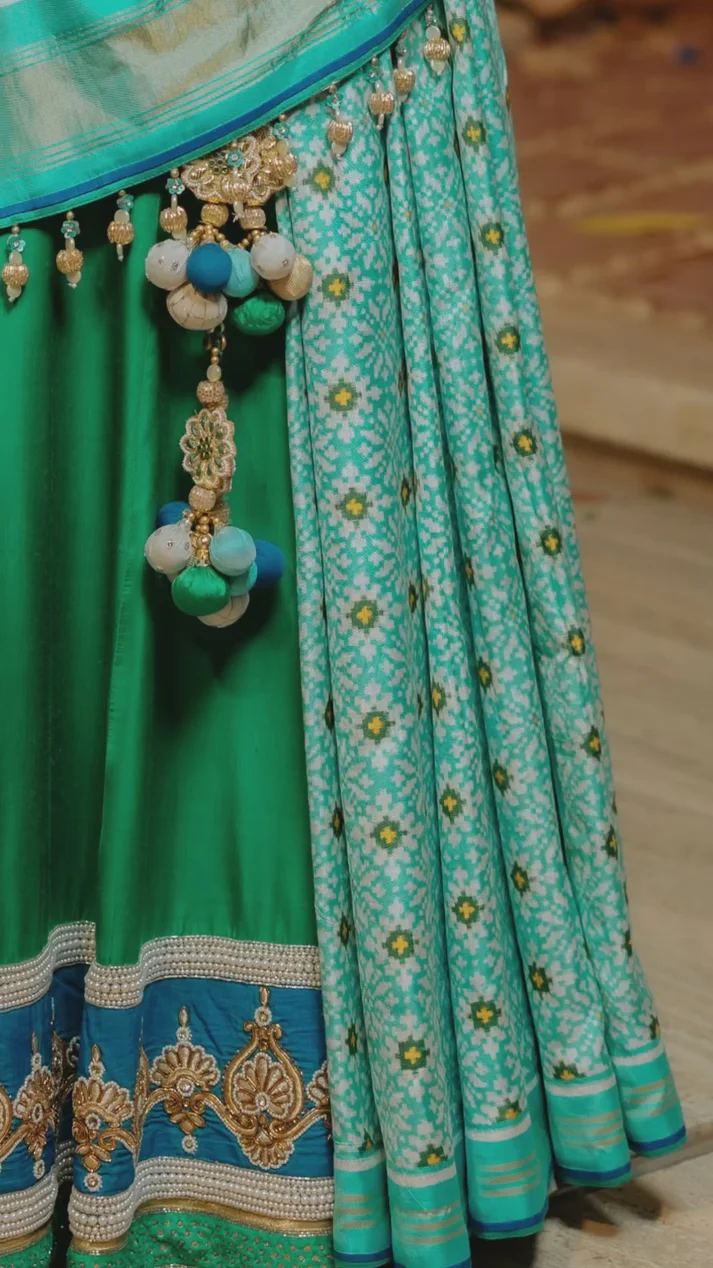 For our clients son’s engagement she wanted to incorporate a hathi motif in her look. We crafted a half-and-half lehenga, with a classic silhouette. It featured 2 coloured kalis along with dome-shaped hathi motif hand-embroidery, enhanced the look further by draping a patola saree as her dupatta.