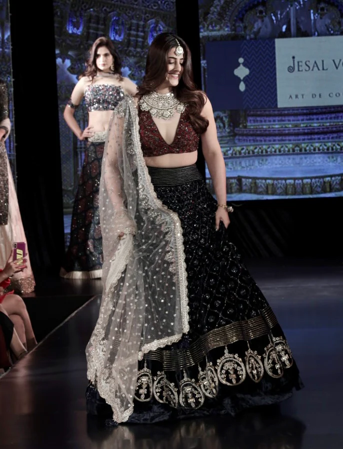We created this exquisite Signature Jesal Vora chandbali lehenga in velvet with a custom ajrak handcrafted blouse in maroon that elevated the look, which reflected her personality and preferences. The lehenga was complemented by a gold net dupatta, which brought the entire look together.