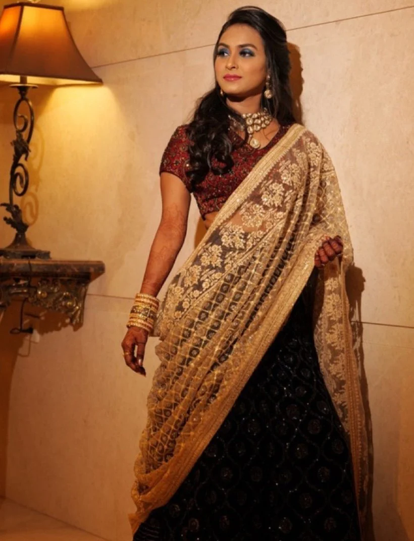 Our Marvari bride wanted a classic look for her reception but wanted to experiment with different colours. We created this Signature Jesal Vora chandbali lehenga with a custom ajrakh blouse. We also added a hand-embroidered lucknowi dupatta to uplift her entire look.