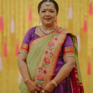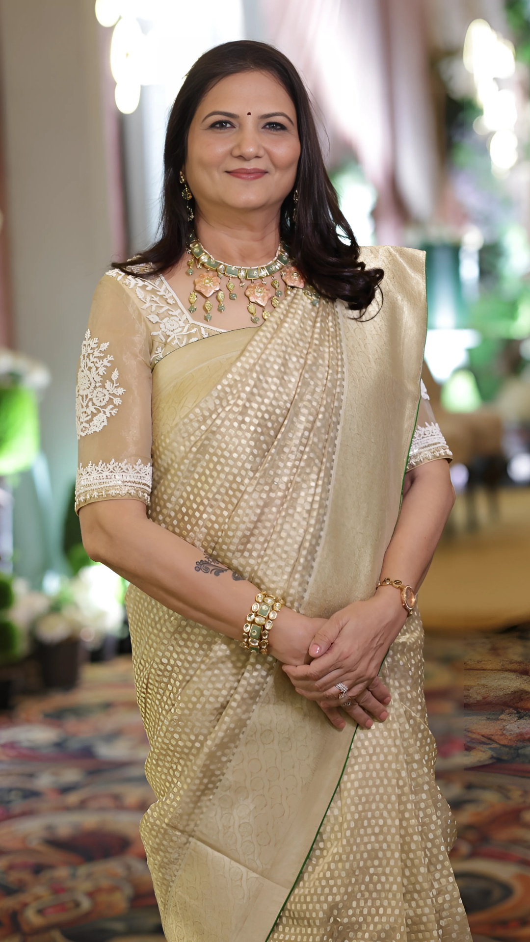 For our JV Mother, we designed a timeless Banarasi Tissue saree in soft cream and gold, paired with a hand-embroidered blouse adorned with delicate moti beads and intricate Zardozi work.