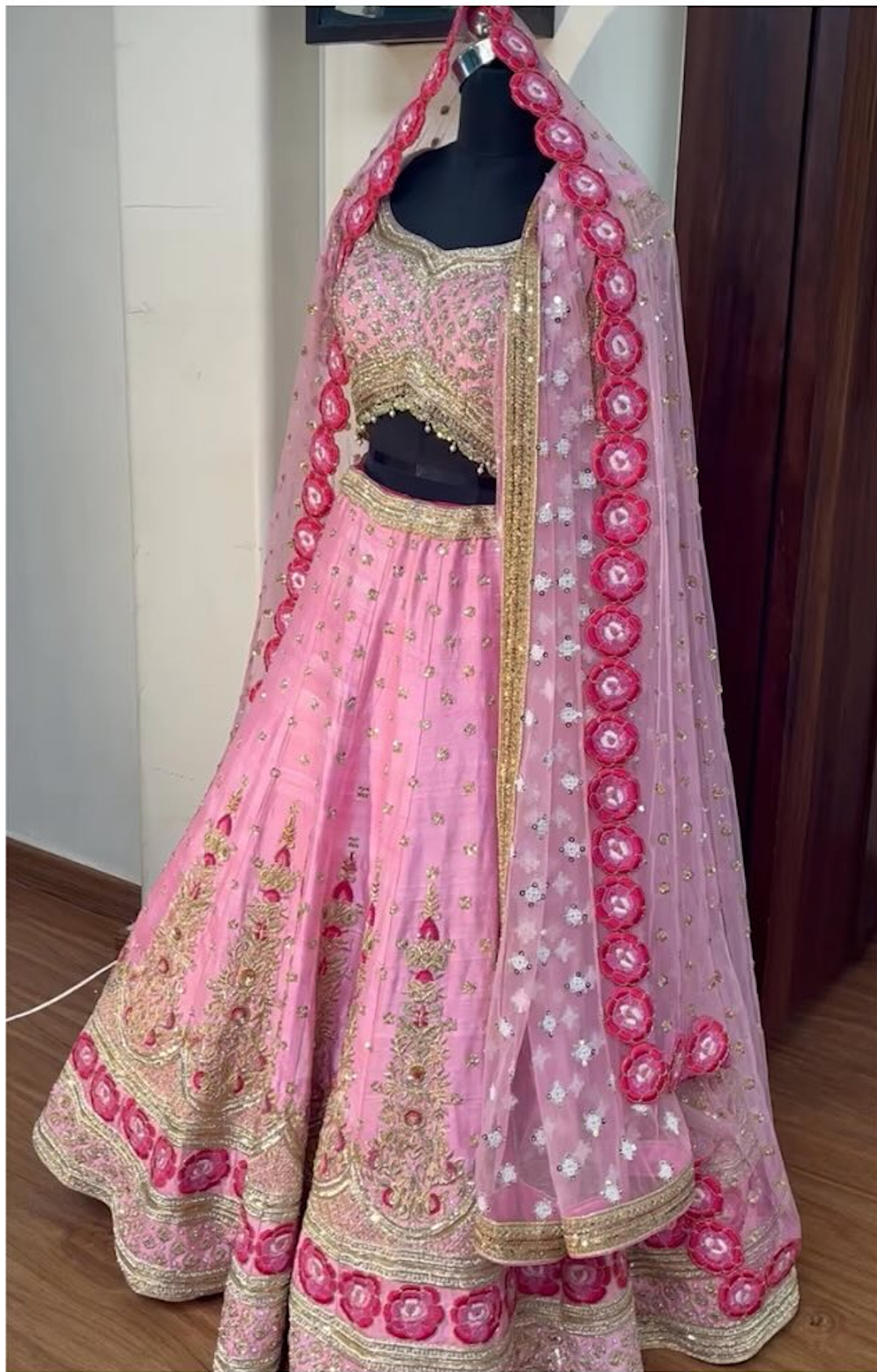 Our bride from Florida was extremely keen on incorporating her company’s logo- a rose in her bridal lehenga. She wanted an outfit that would complement her theme and fit in with her Miami beach wedding. We curated this stunning pink lehenga set, incorporating the rose in the most artistic manner possible, in both her lehenga and veil. This gorgeous bespoke look was crafted to uplift her personality.