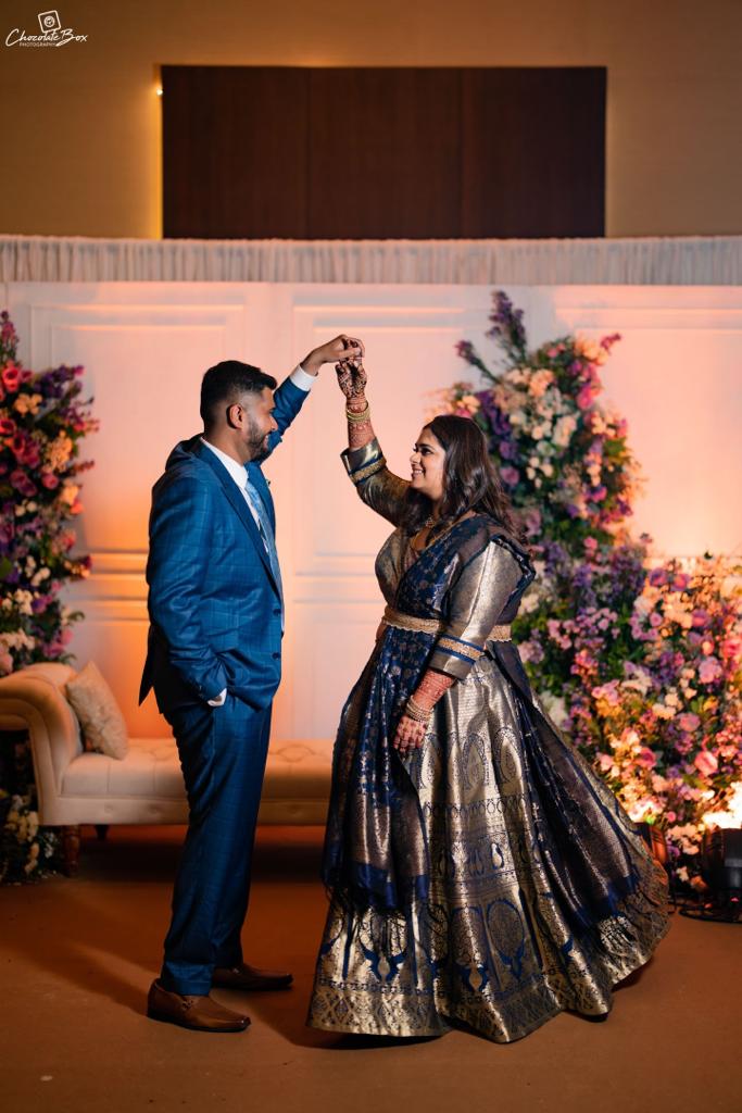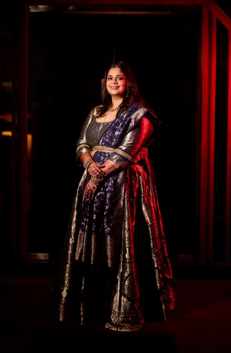 Our bride wanted an outfit that complemented her husband’s South Indian traditions and culture for her reception. We gave her a classic banarasi navy blue silk lehenga as per their tradition and culture. We modified the blouse and added elements keeping in mind her personality.