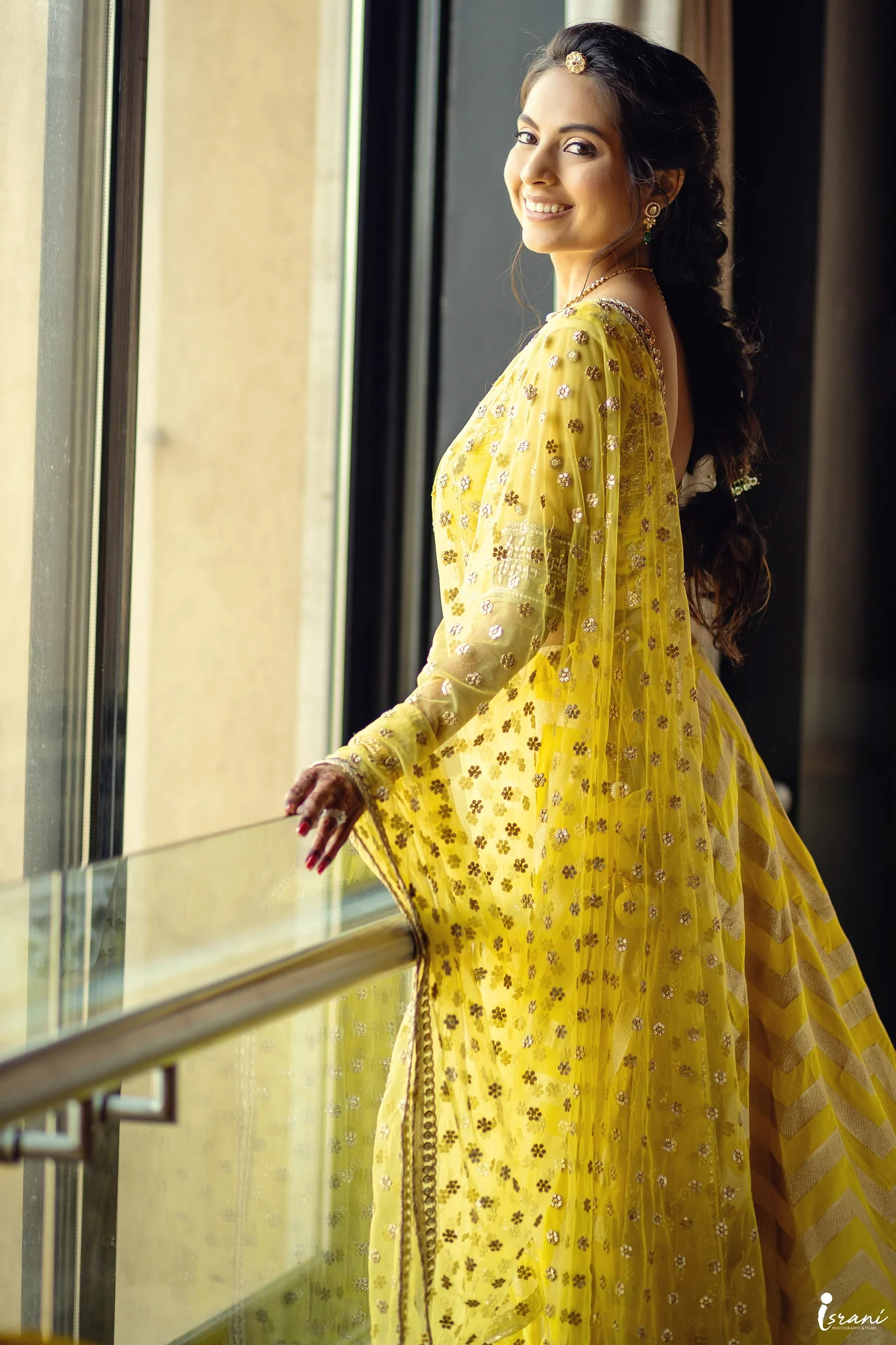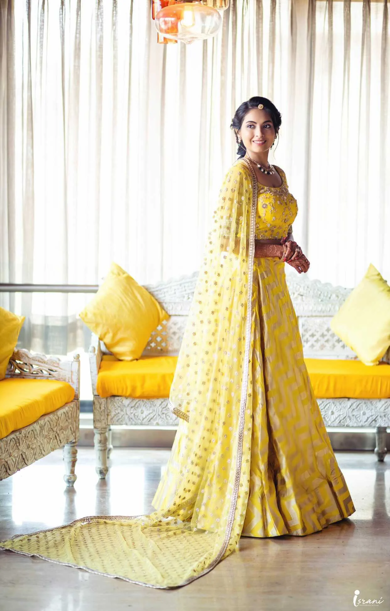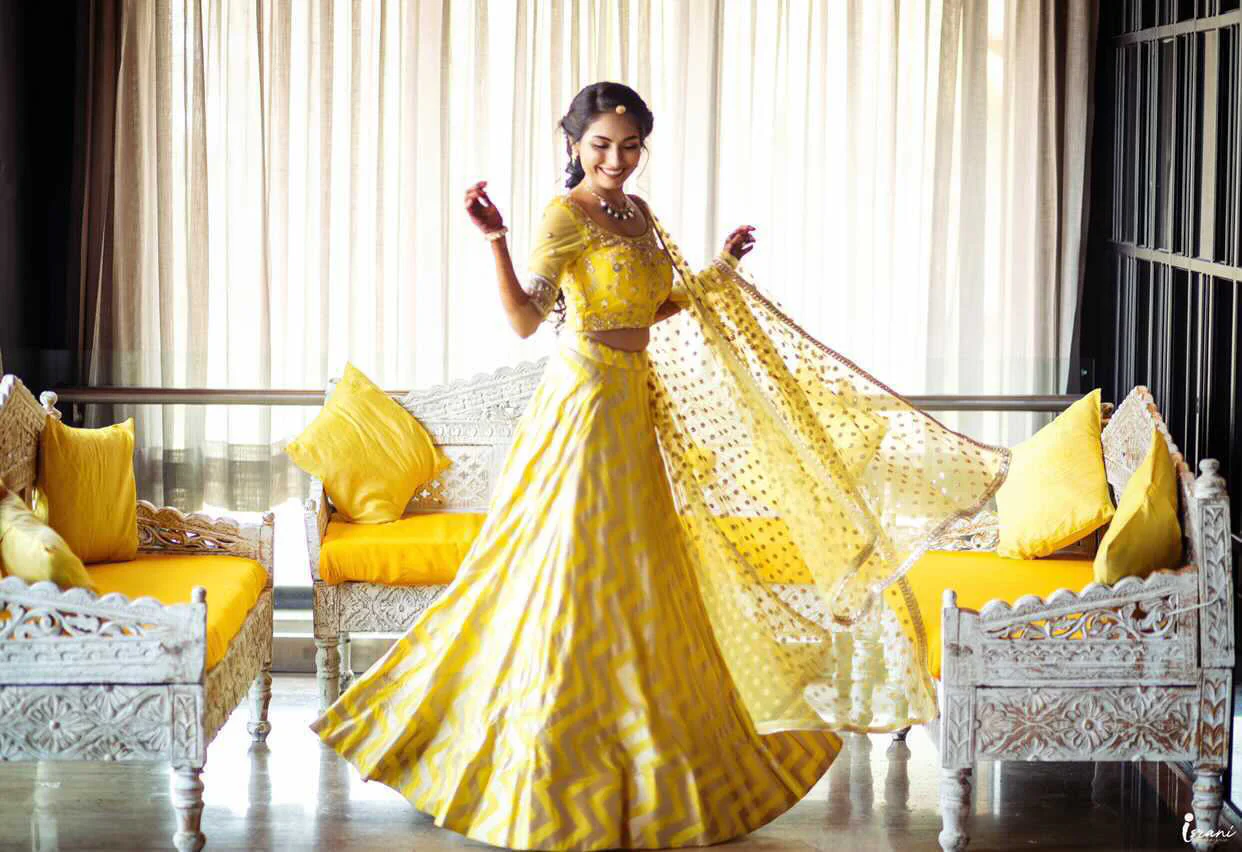 Our bride from the US wanted a comfortable and versatile look for her, haldi. We created this handcrafted banarasi look with a chevron weave for her adding to the contemporary touch.