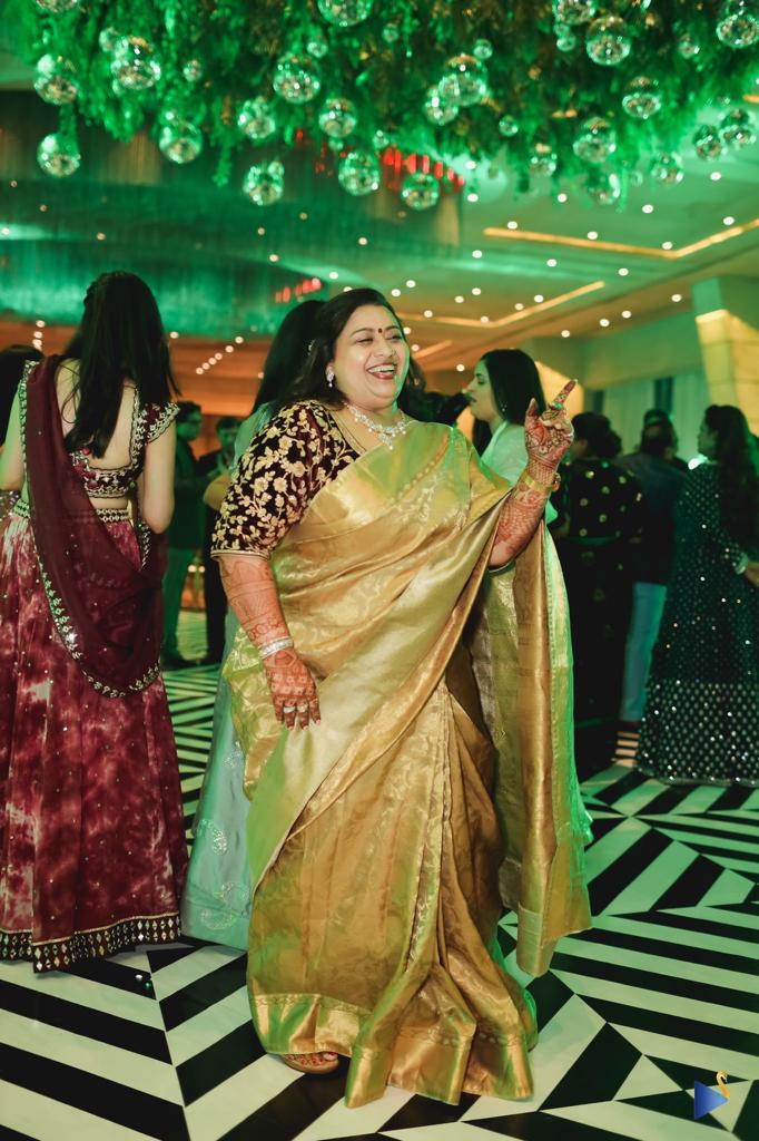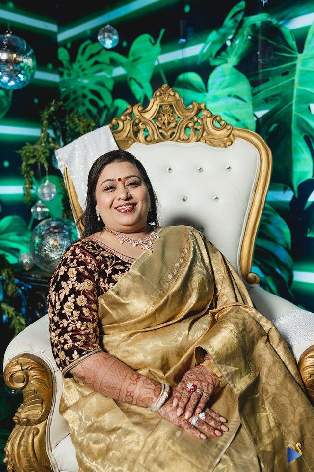 We created this beautiful banarasi silk saree look for our client’s son’s reception. We picked a timeless gold shade, bringing elegance to the look, and elevated it with a maroon velvet zardozi blouse, breaking the monotones.