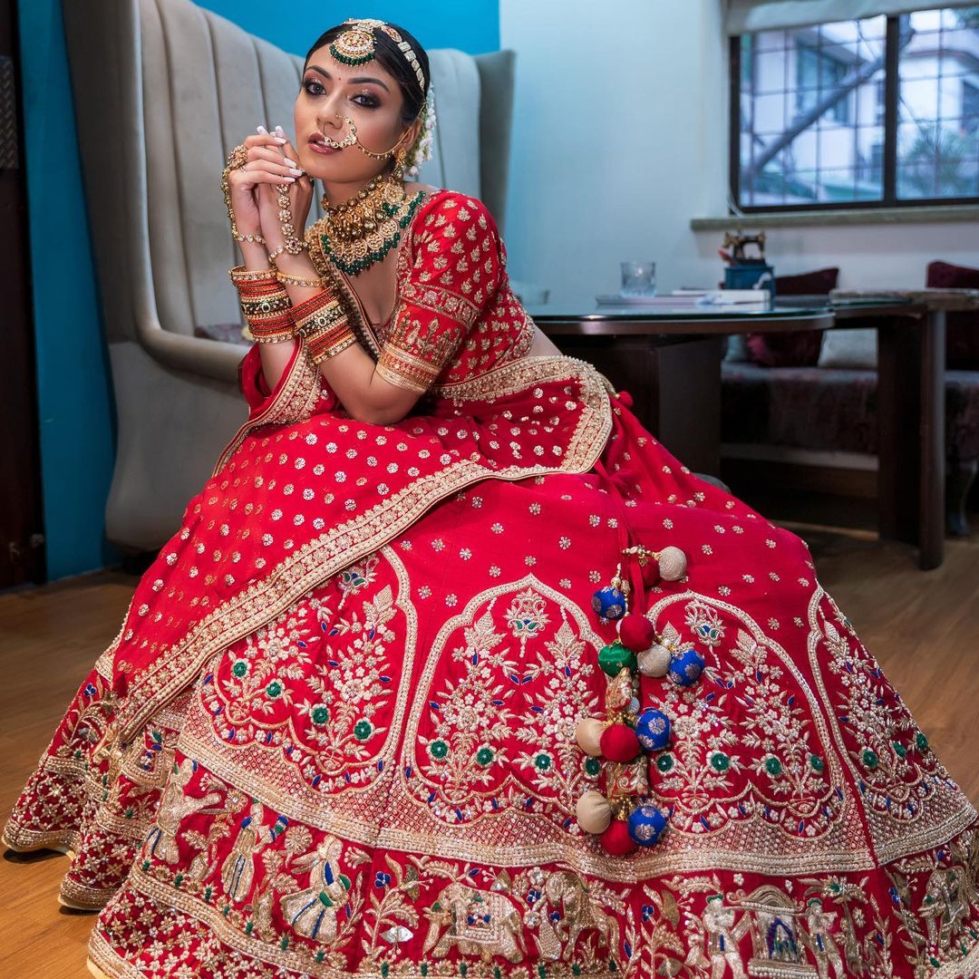 Our bride wanted a cherry red, traditional lehenga with a baarat border. We also added delicate touches of green and blue to complement her emerald and sapphire jewellery.