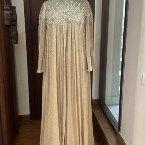 We curated this elegant black silk gown, with ruffles sleeves. We elevated the look with statement embellished embroidery featured on one sleeve.