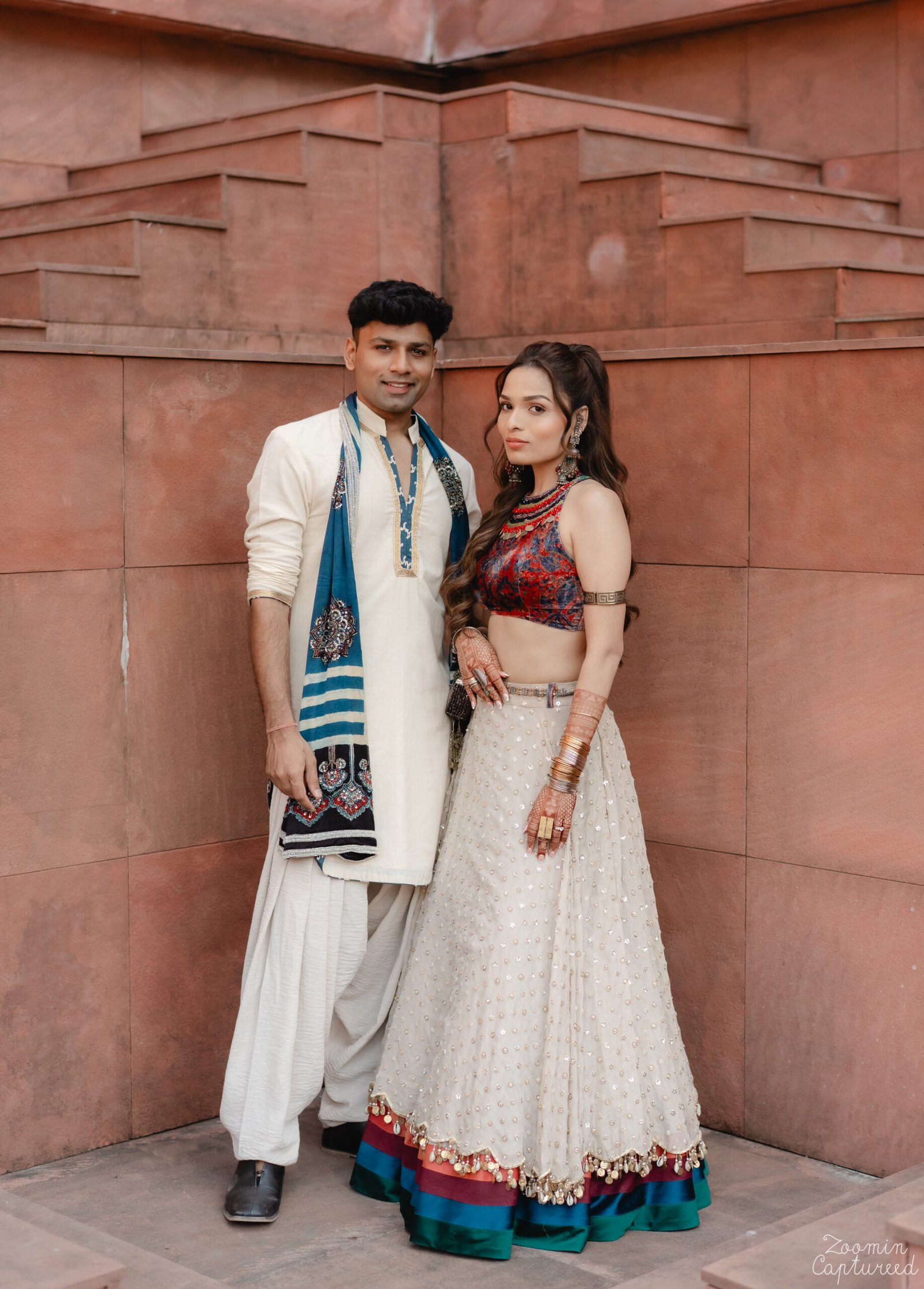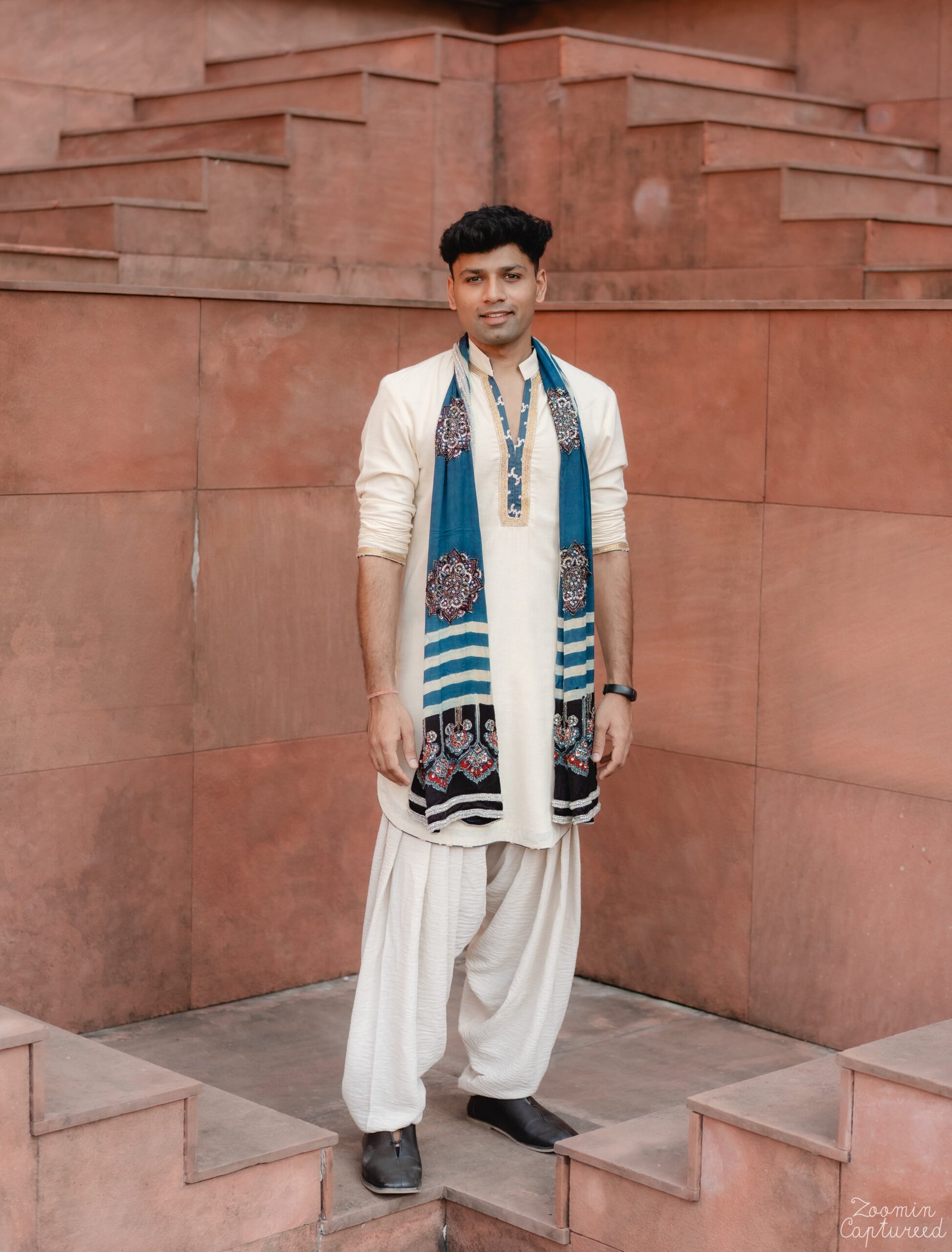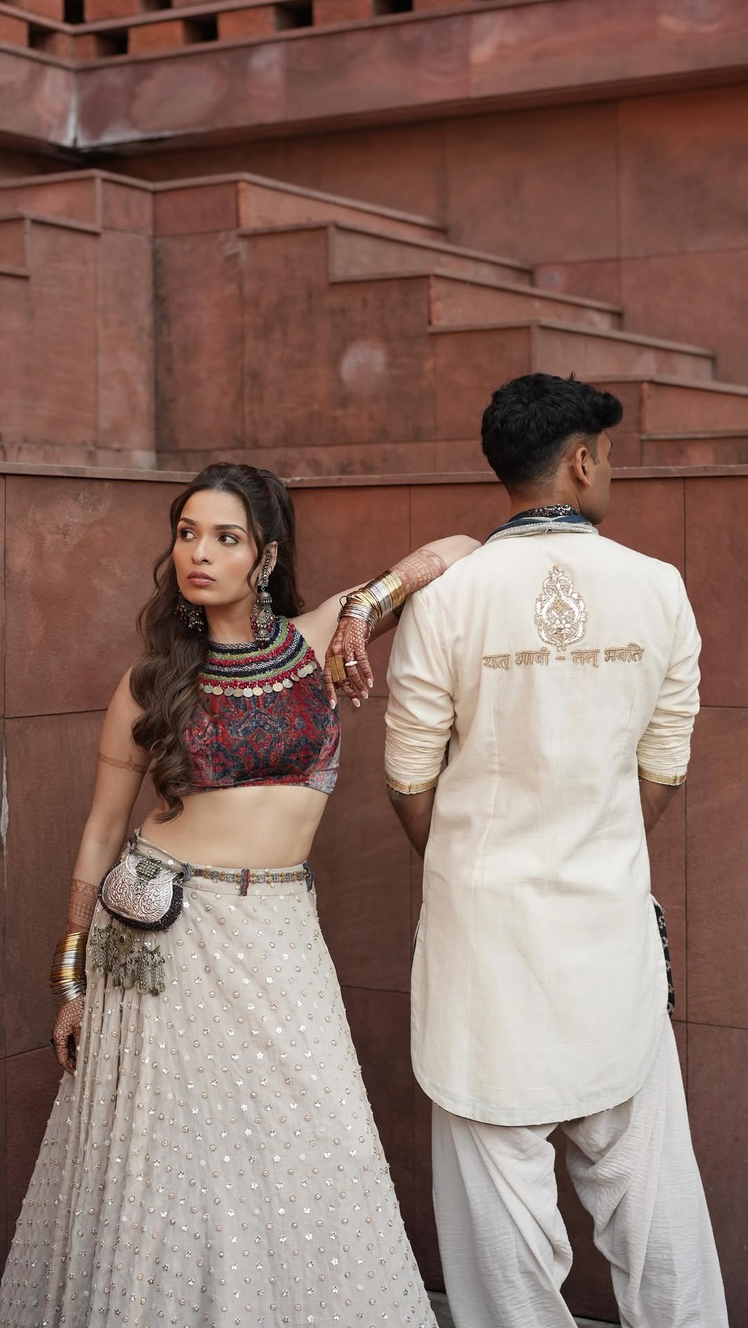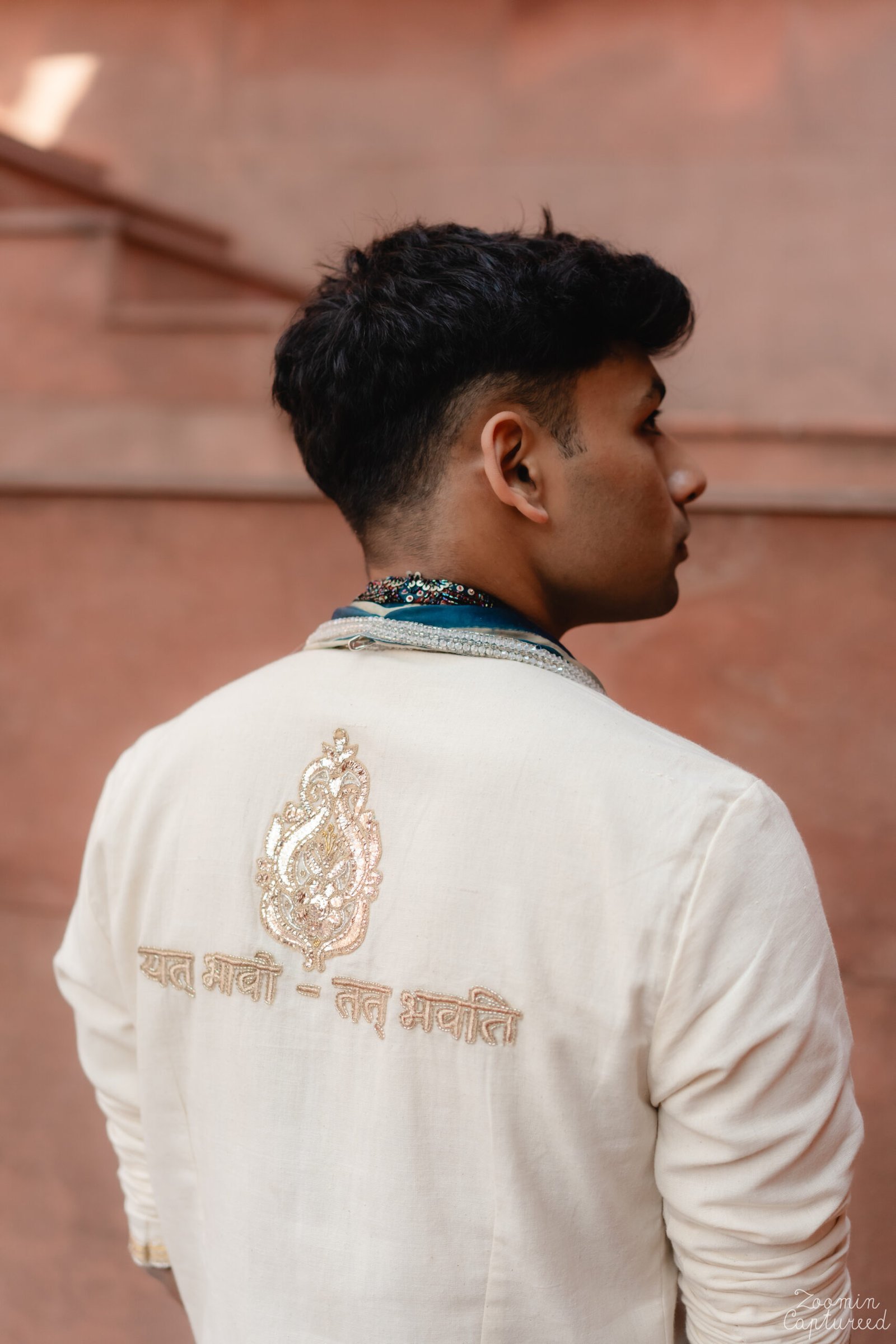 Designed with meaning and intention, our client’s welcome look featured a khadi kurta set paired with an Ajrakh stole. The Sanskrit mantra on the back — ‘यद् भावि तद् भवति’ (Whatever is destined to happen, will happen) — transformed the ensemble into a true statement piece.