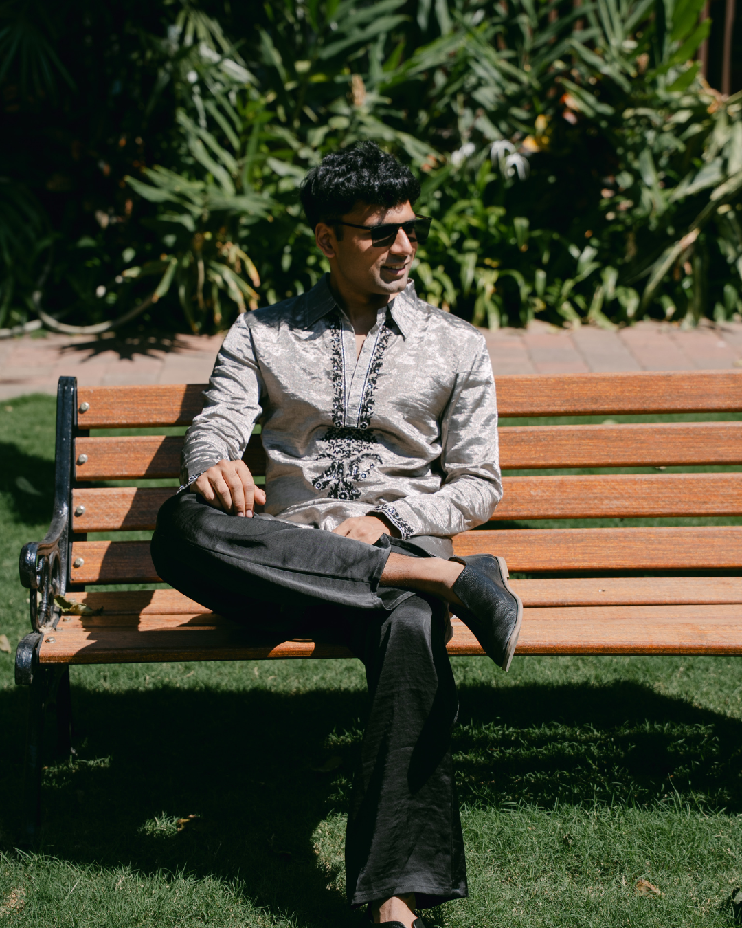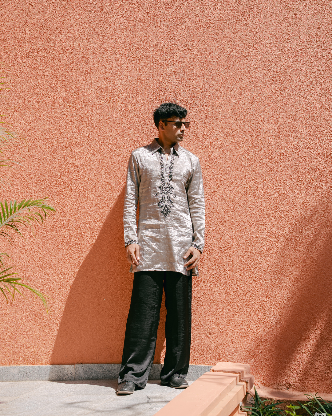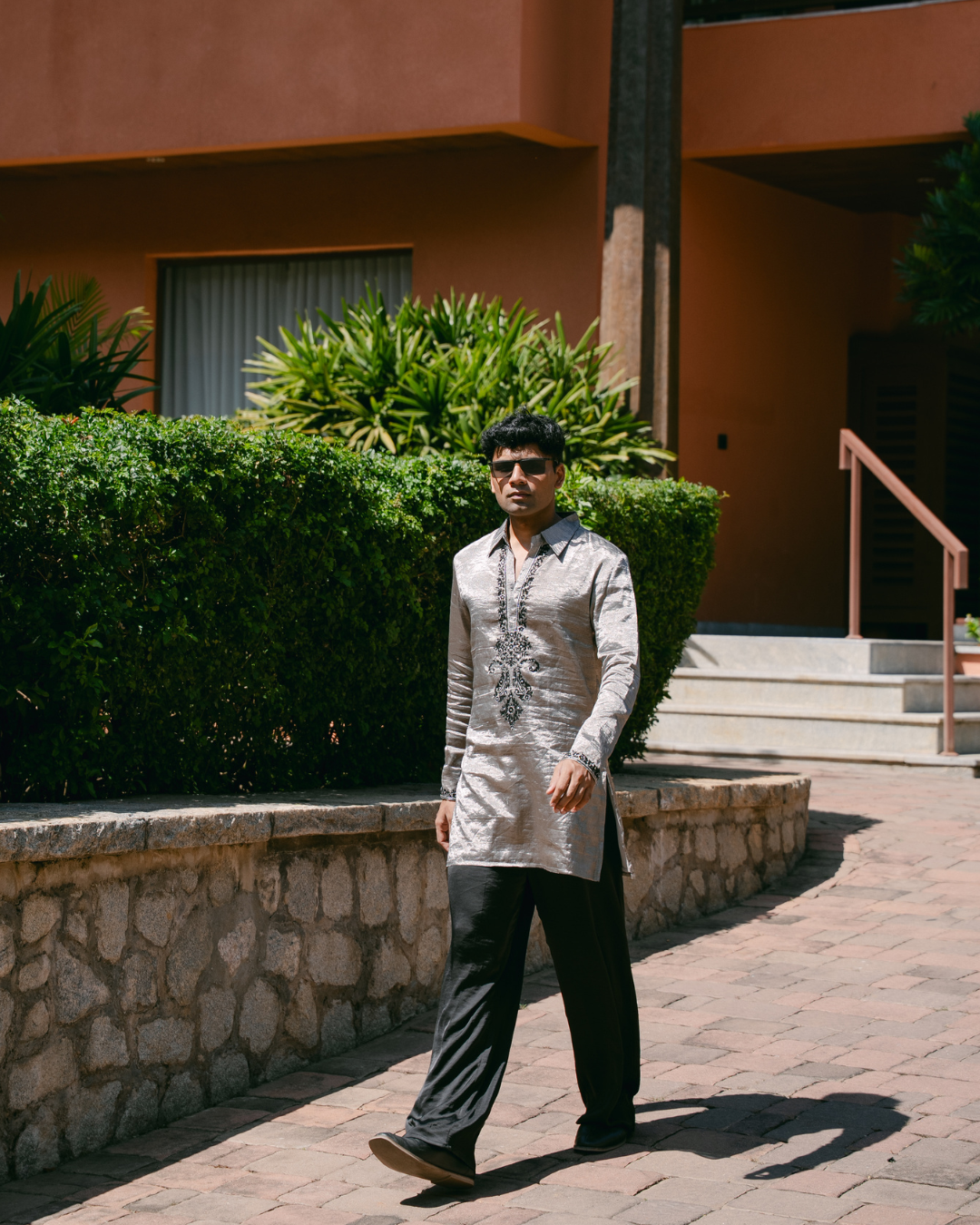 Our JV client is seen in a grey Banarasi tissue kurta set for his sister’s mehendi ceremony, elevated with hand-embroidered detailing on the neckline.