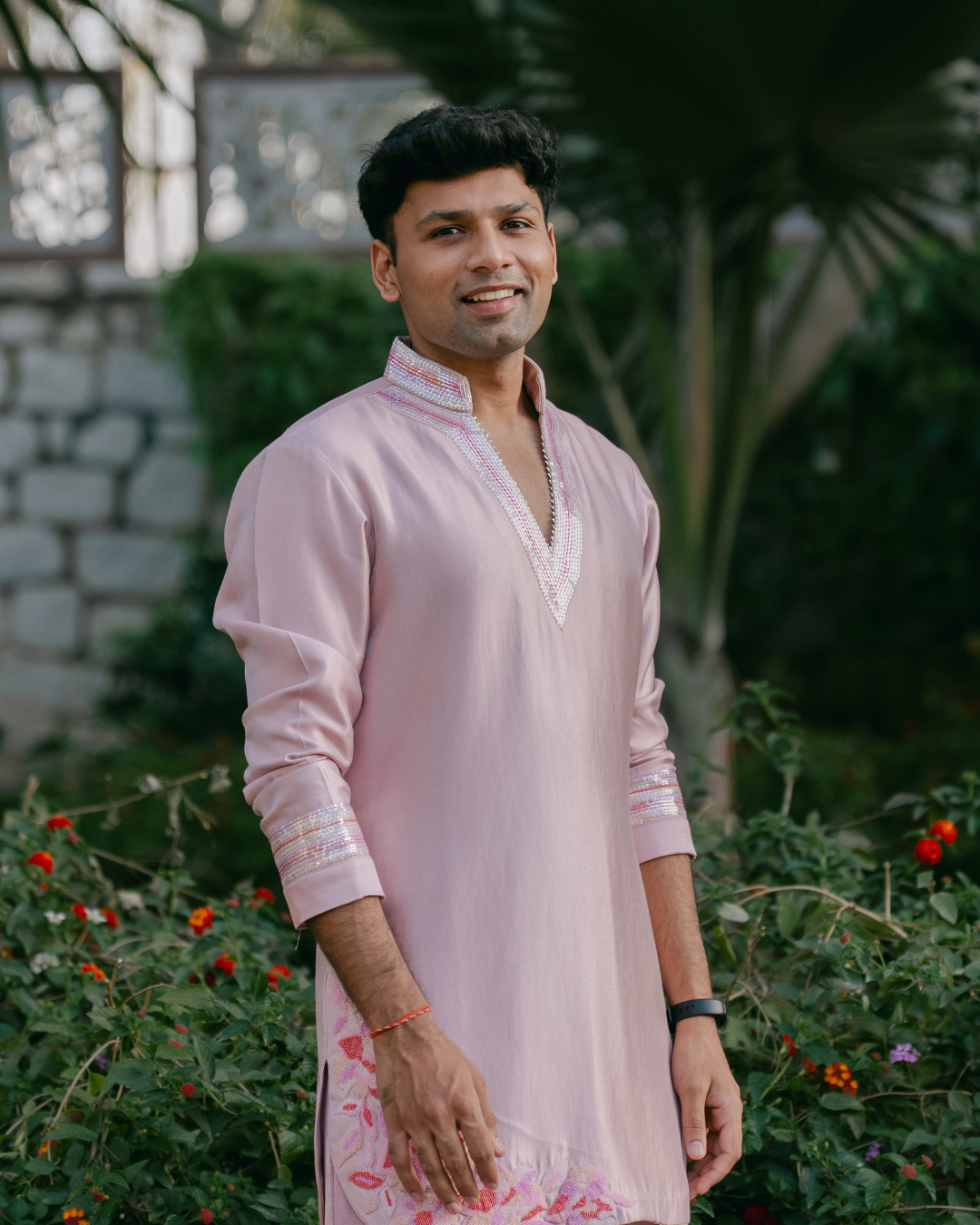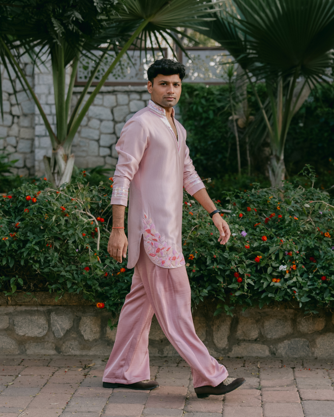 We designed a kurta set, with a contemporary silhouette. It featured a distinctive apple cut hem that adds movement. The look is elevated with delicate pearl embroidery on both ends, offering a subtle touch of craftsmanship and sophistication. Paired with relaxed, loose-fit pants, this ensemble ensures both comfort and effortless elegance—perfect for festive occasions.