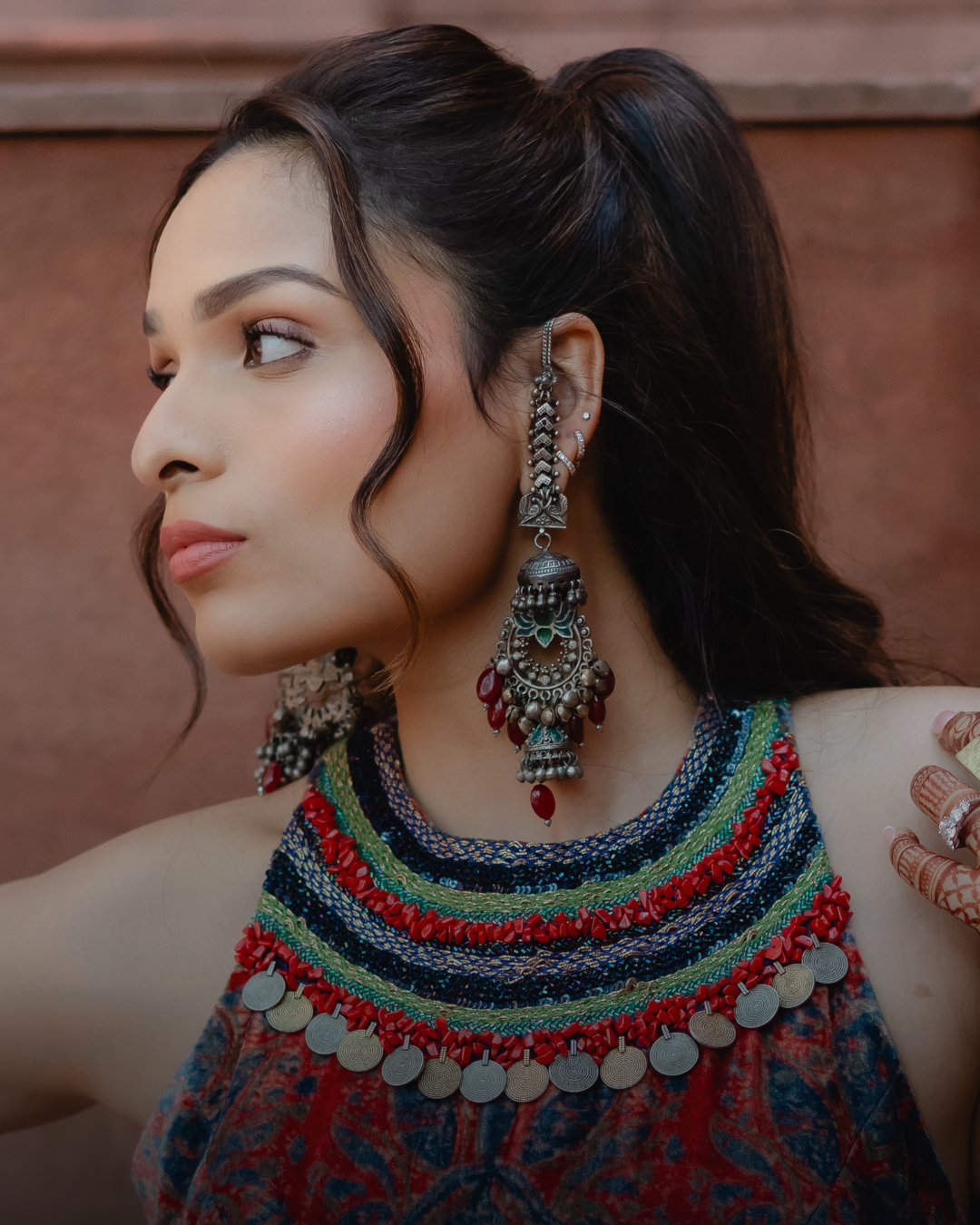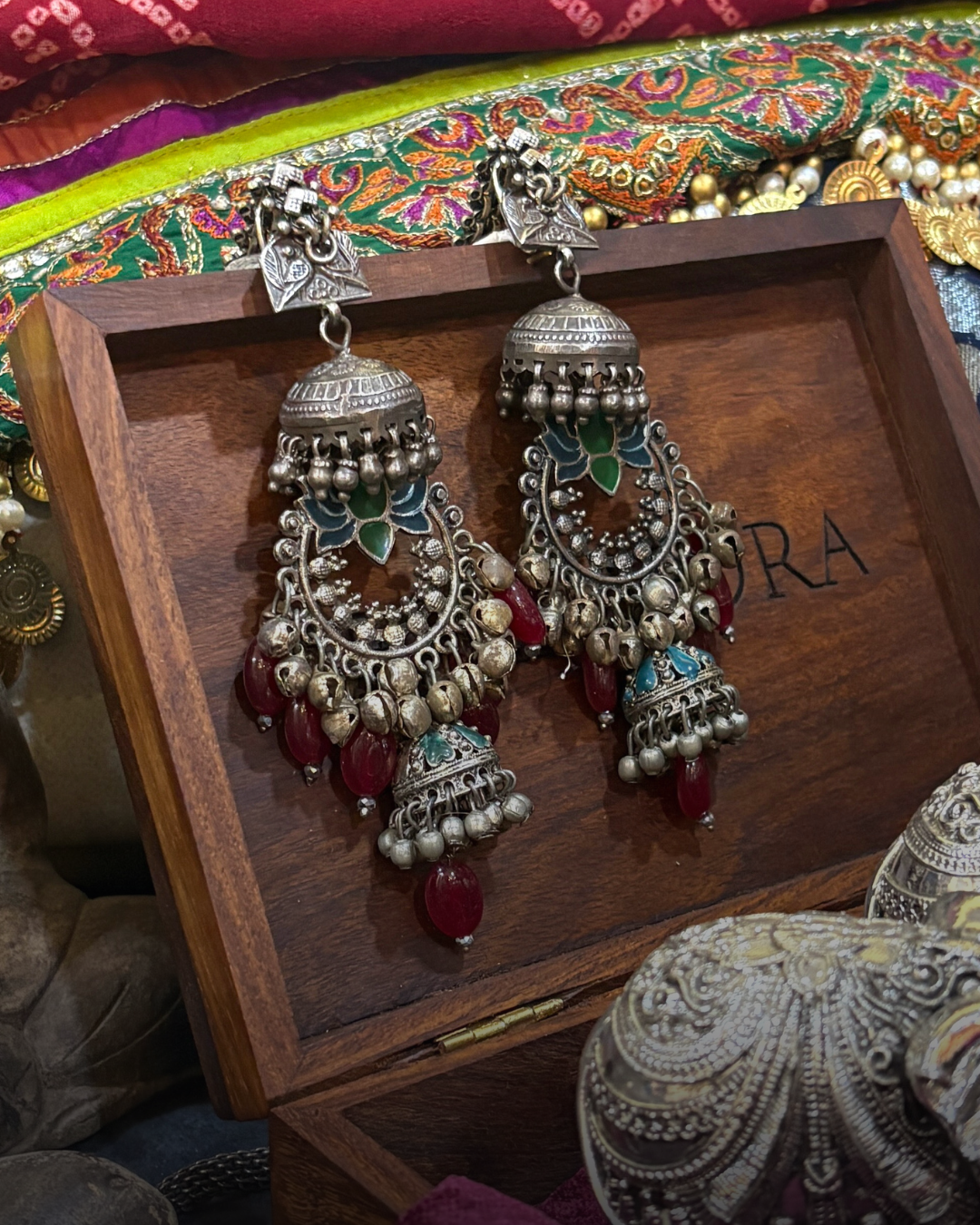 Marking the start of our co-founder’s celebrations, we designed a timeless pair of earrings for her—an ode to heritage and craftsmanship. Handcrafted in pure silver and adorned with red stones, the design centres around a sacred lotus motif symbolising purity, finished with traditional earring chains.