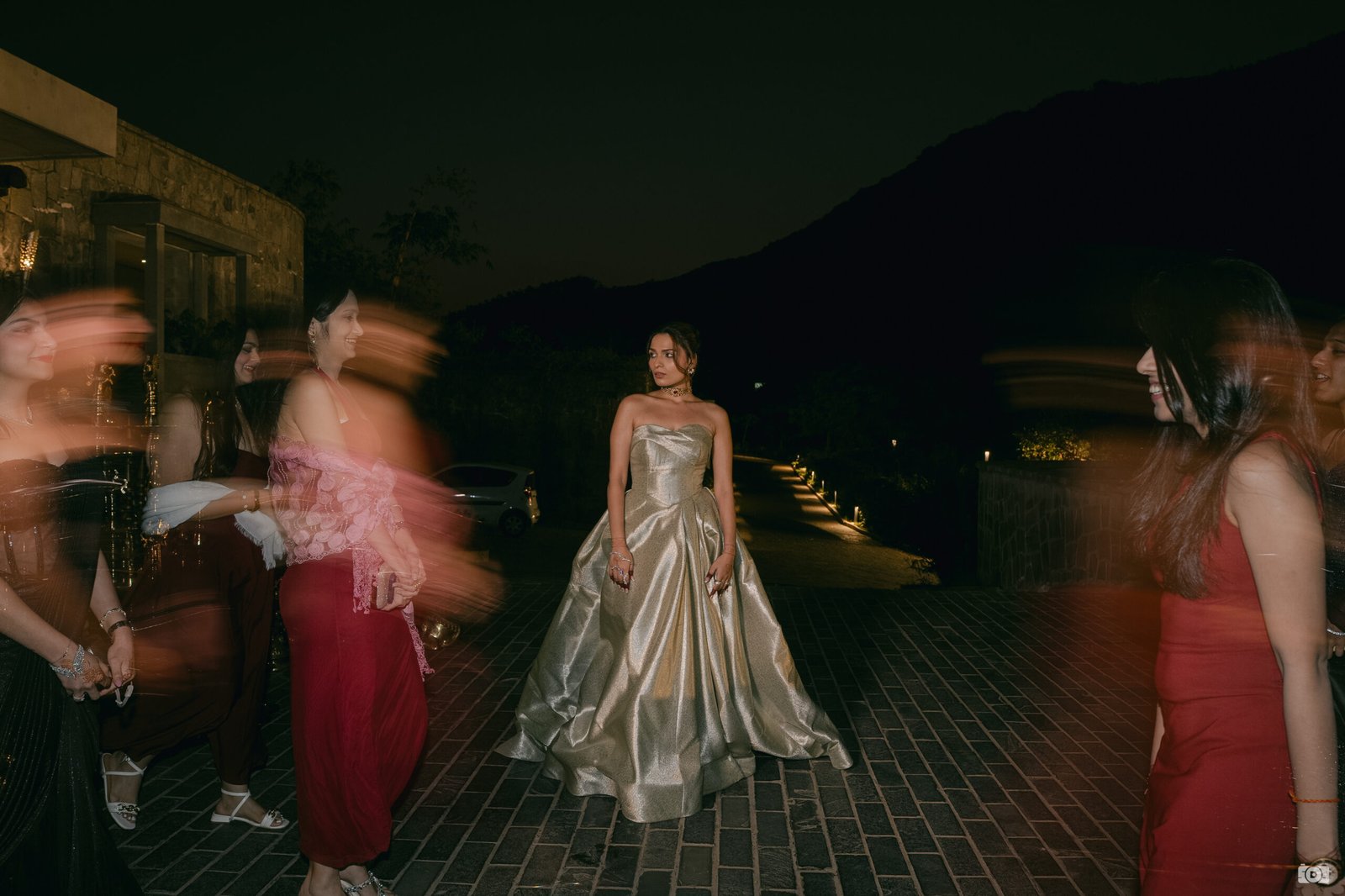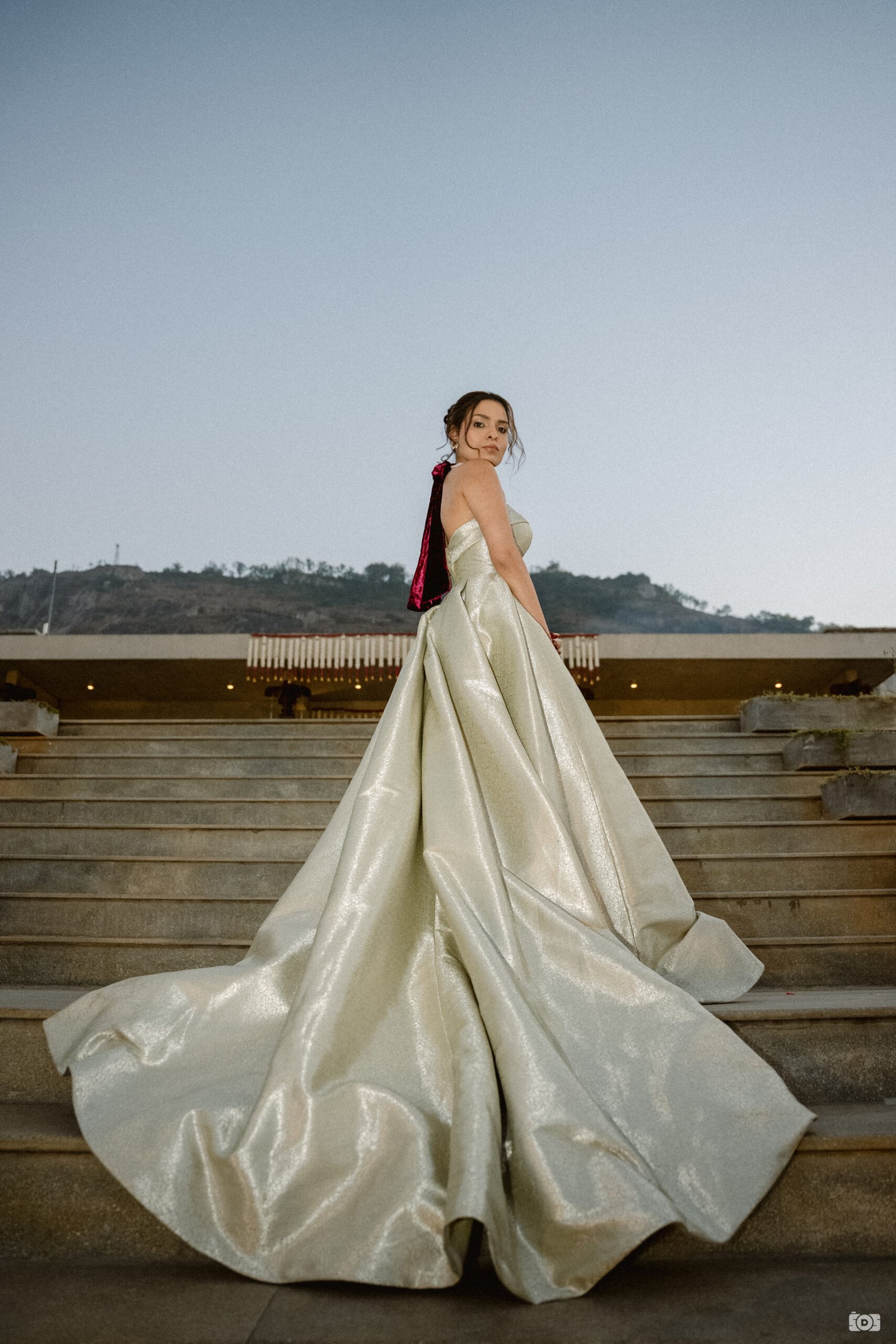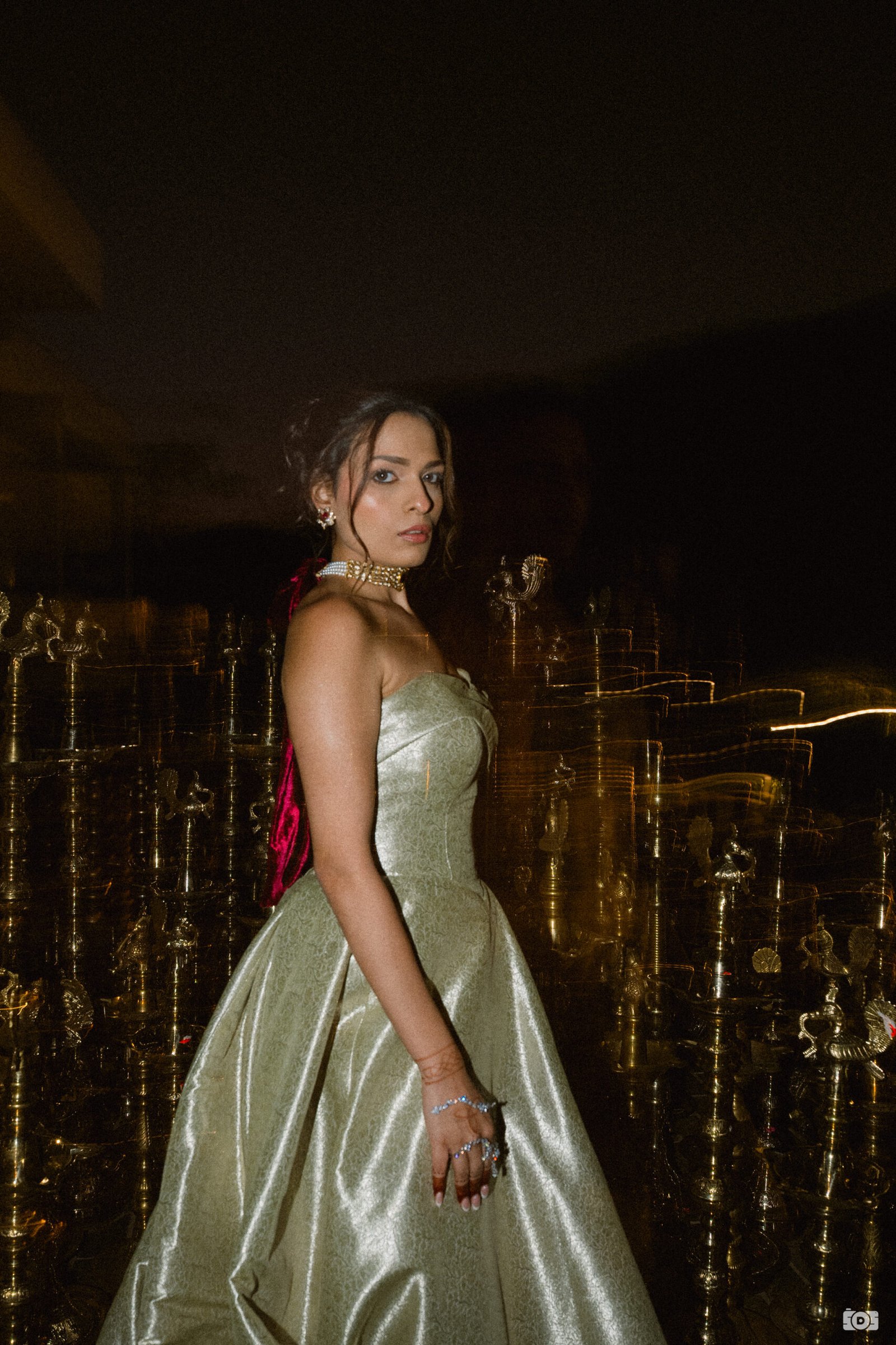 We designed a Banarasi-woven gown for our co-founder, reimagining traditional Indian craftsmanship through a contemporary silhouette. It was paired with a bespoke Polki and Ruby choker, finished with a velvet bow. Thoughtfully designed by JV Jewels, the piece transforms seamlessly into a bracelet.