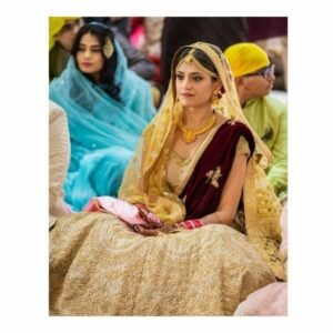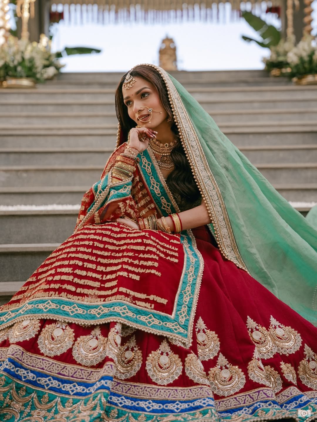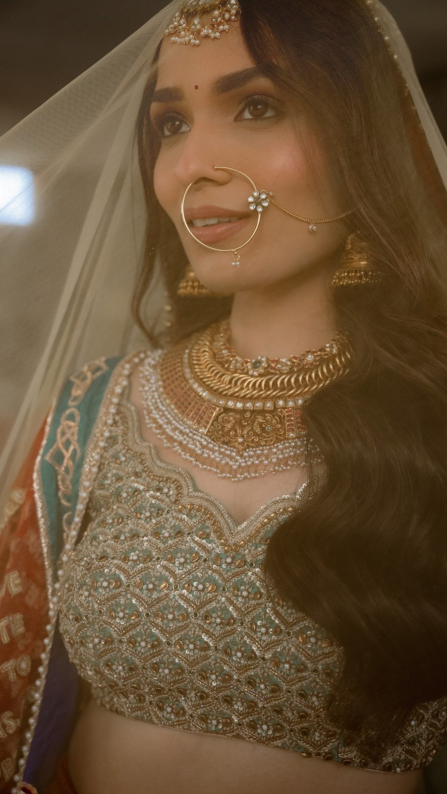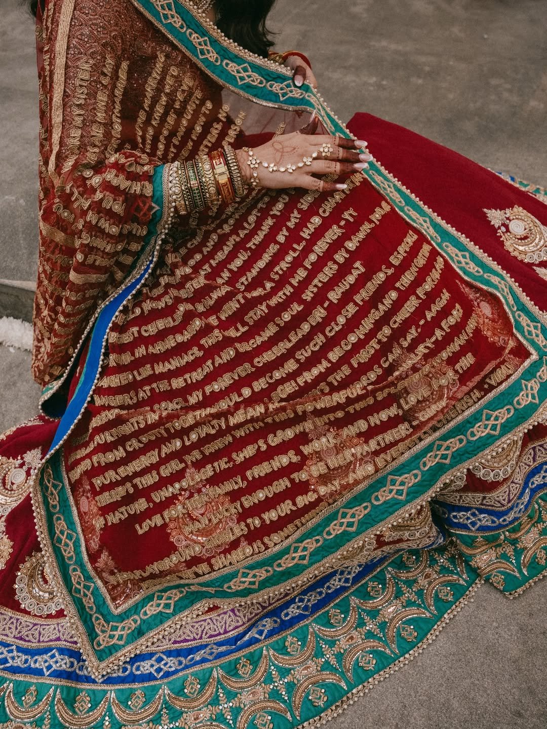 For our co-founder’s wedding we designed a one-of-a-kind red and teal lehenga set that beautifully captured her story and spirit. The lehenga featured our signature JV chandbali motifs, while the dupatta was intricately embroidered with handwritten messages from all her childhood friends—making it truly unforgettable.