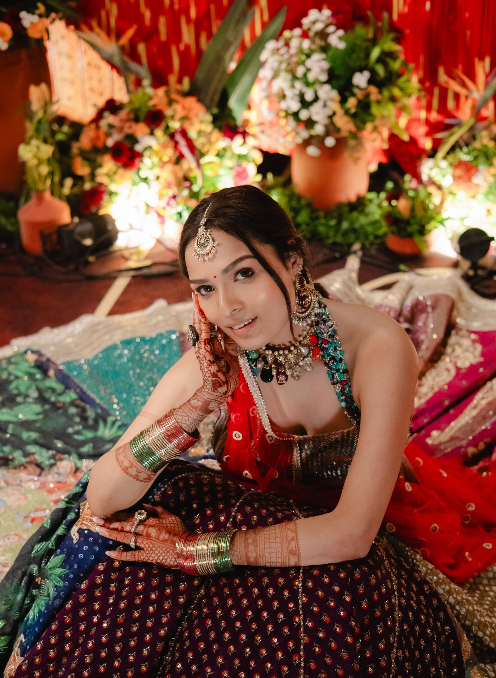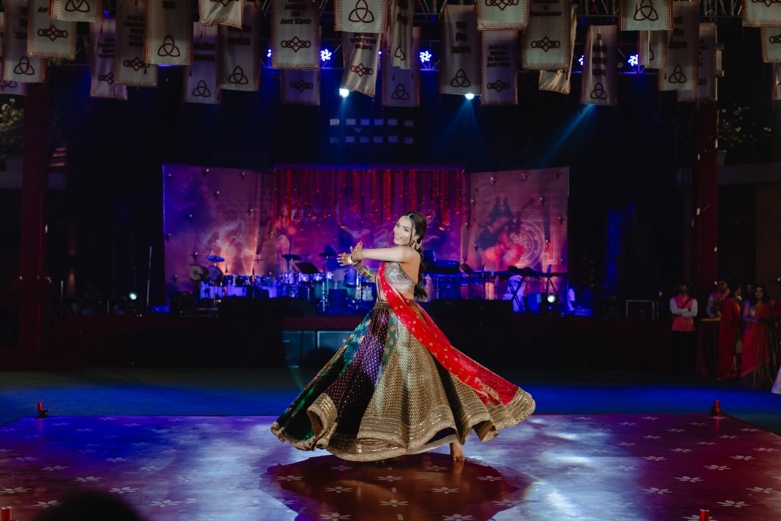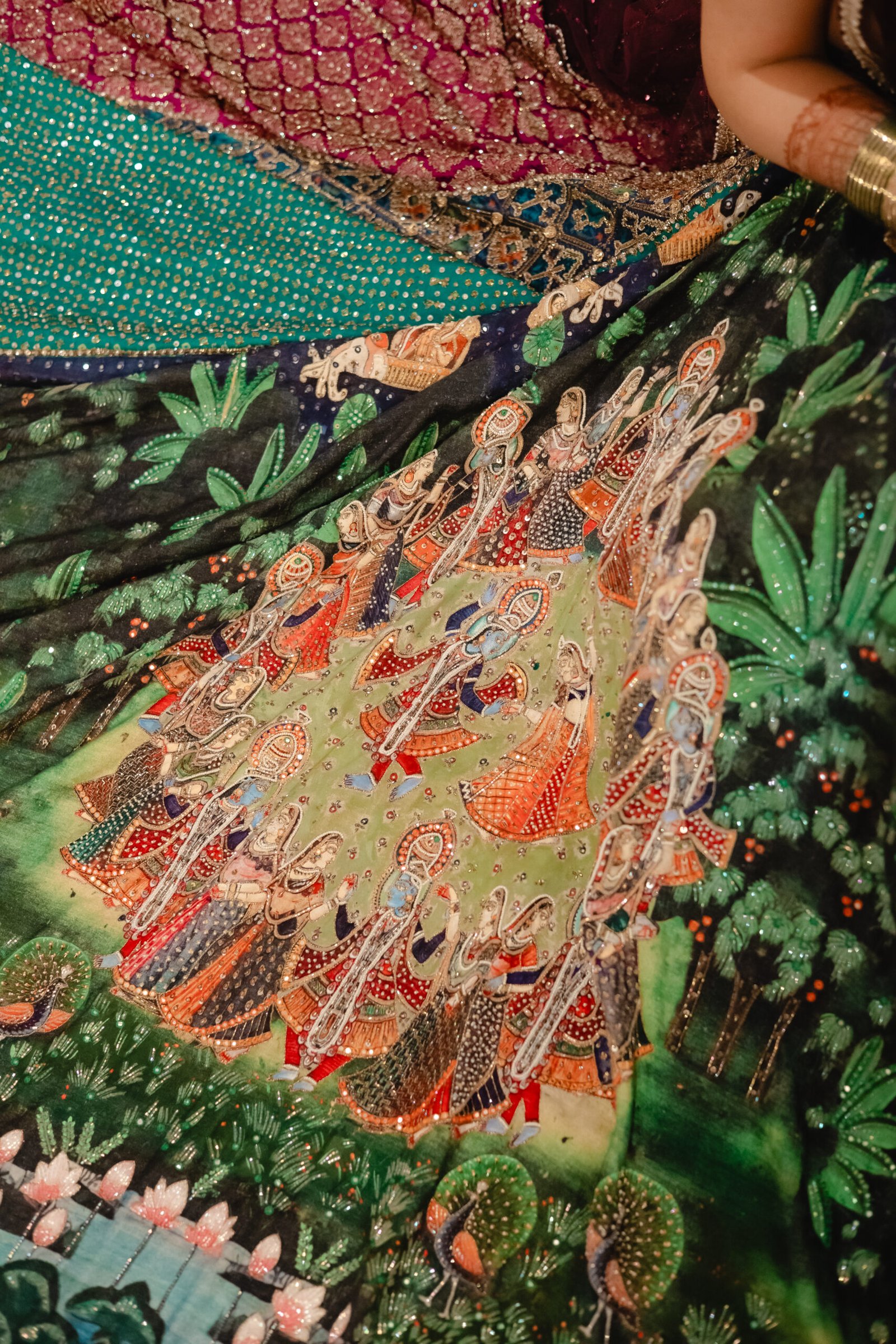 For our co-founder, Stuti, we designed a Raas Garba lehenga featuring a hand-painted Krishna Raas Leela panel.